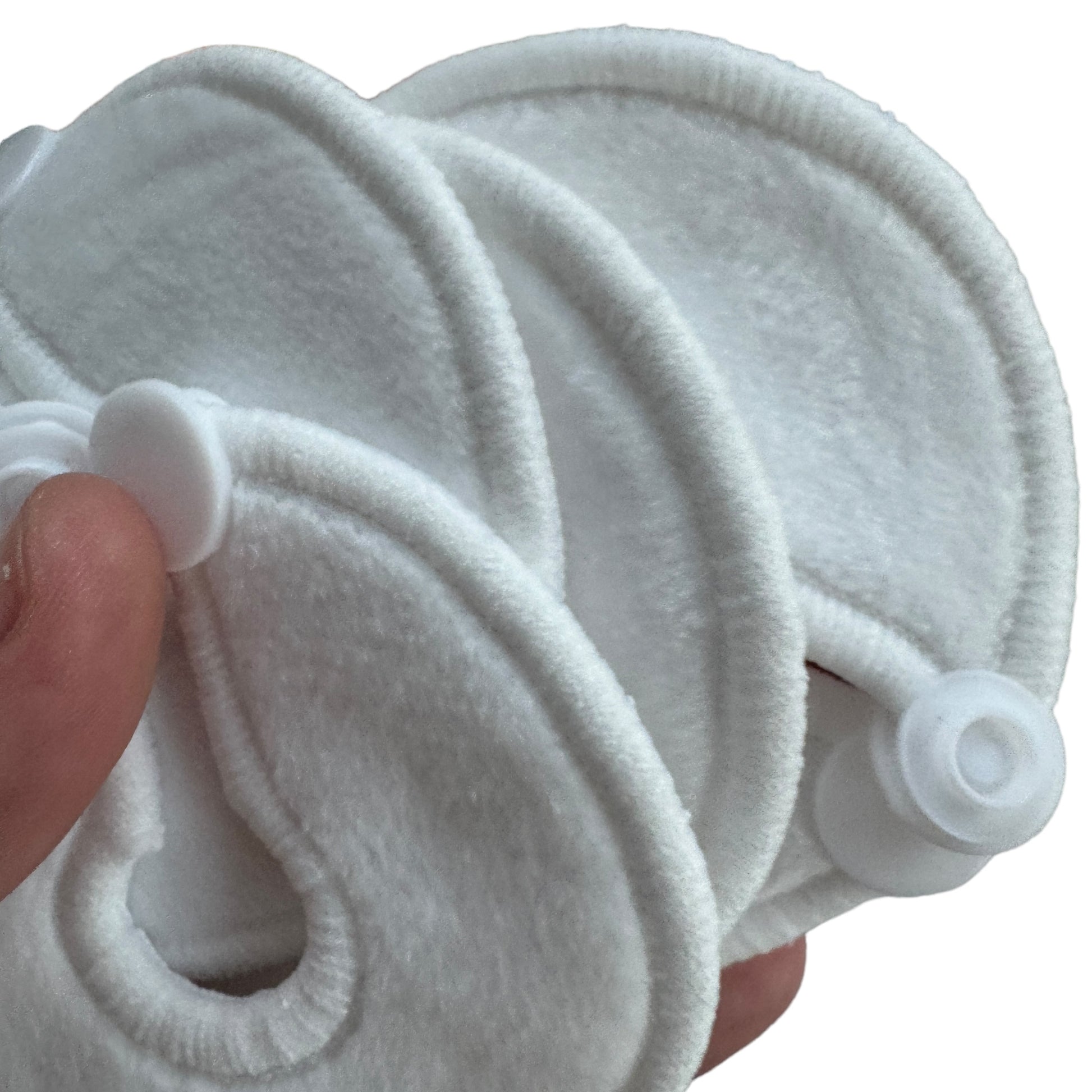 Image Description: Tubie pads that are circular, then have a hole internally with a snap so that you can connect the Tubie pad around the feeding tube stoma site. In a range of colours, the top is a velour fabric.