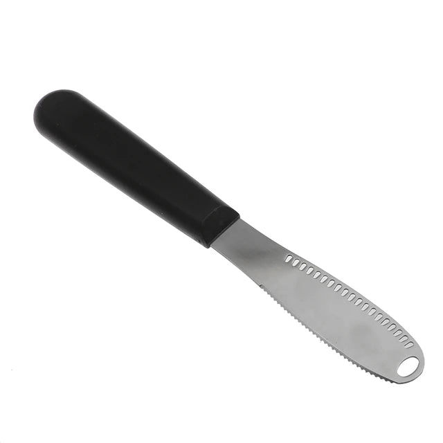 Image Description: A butter knife with a wide stainless steel blade featuring small holes along one edge for grating or curling butter, and a serrated edge for slicing. The handle is thick and black, designed for easy grip. In one image, the knife is being held and used next to sliced butter; in another, three knives are shown resting on a wooden board.