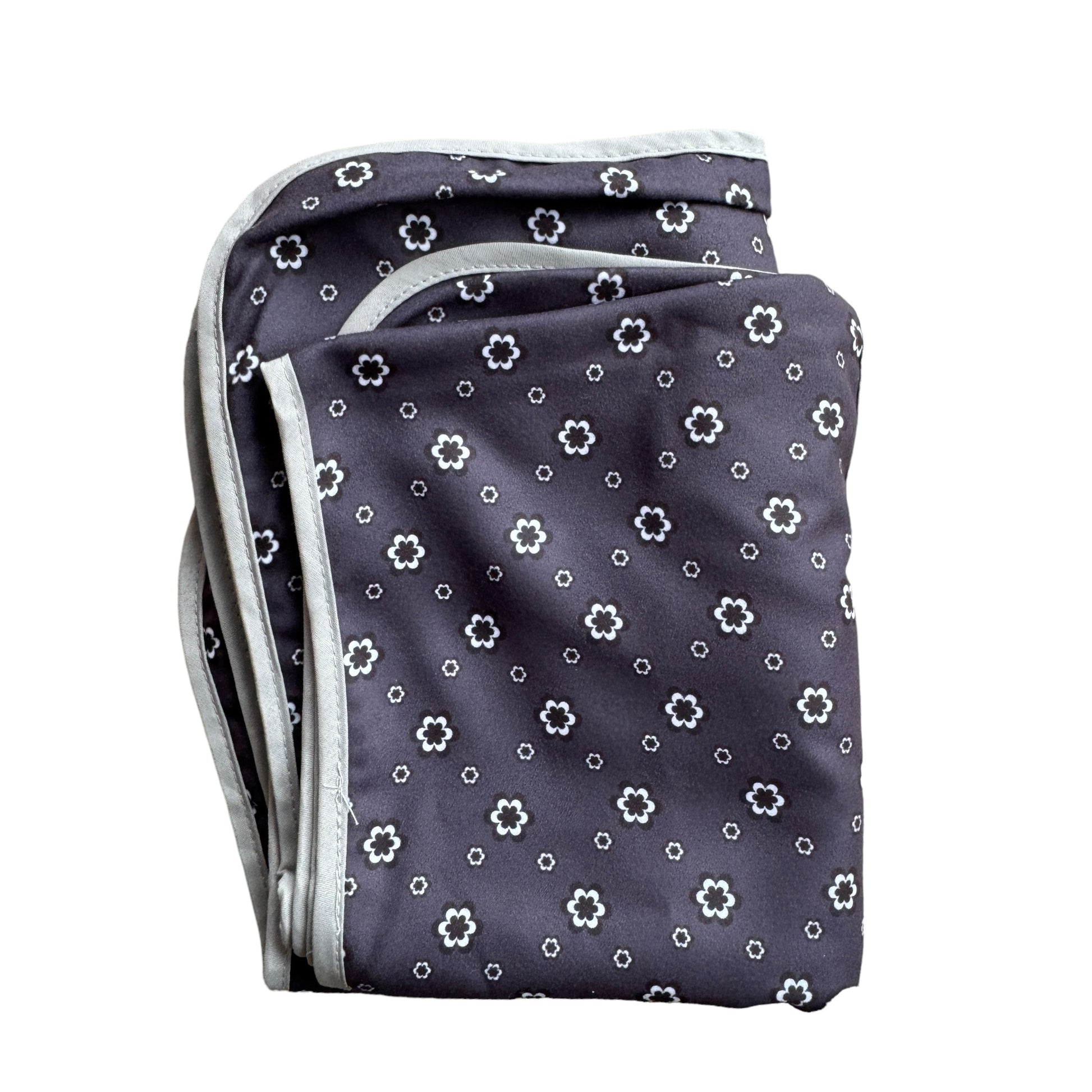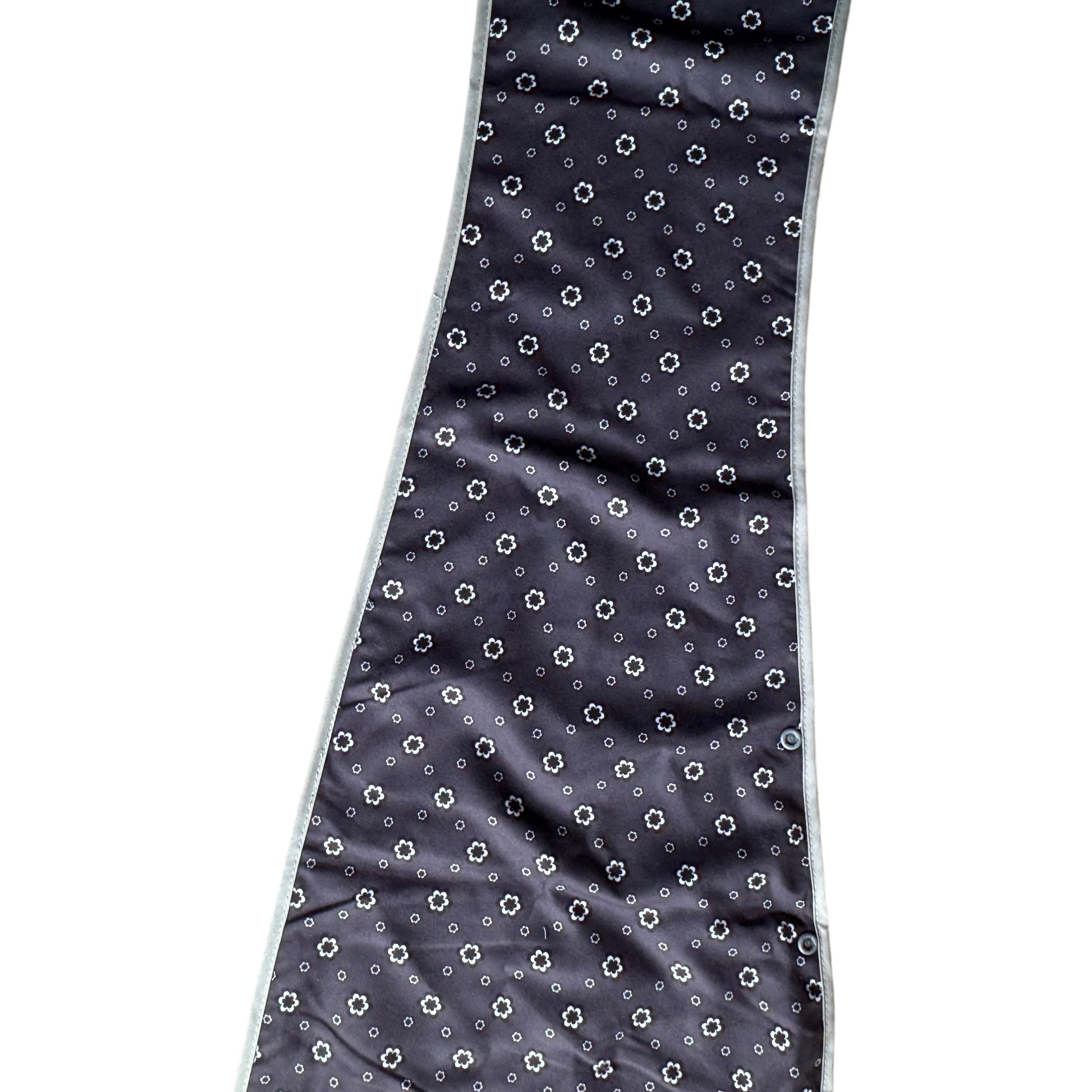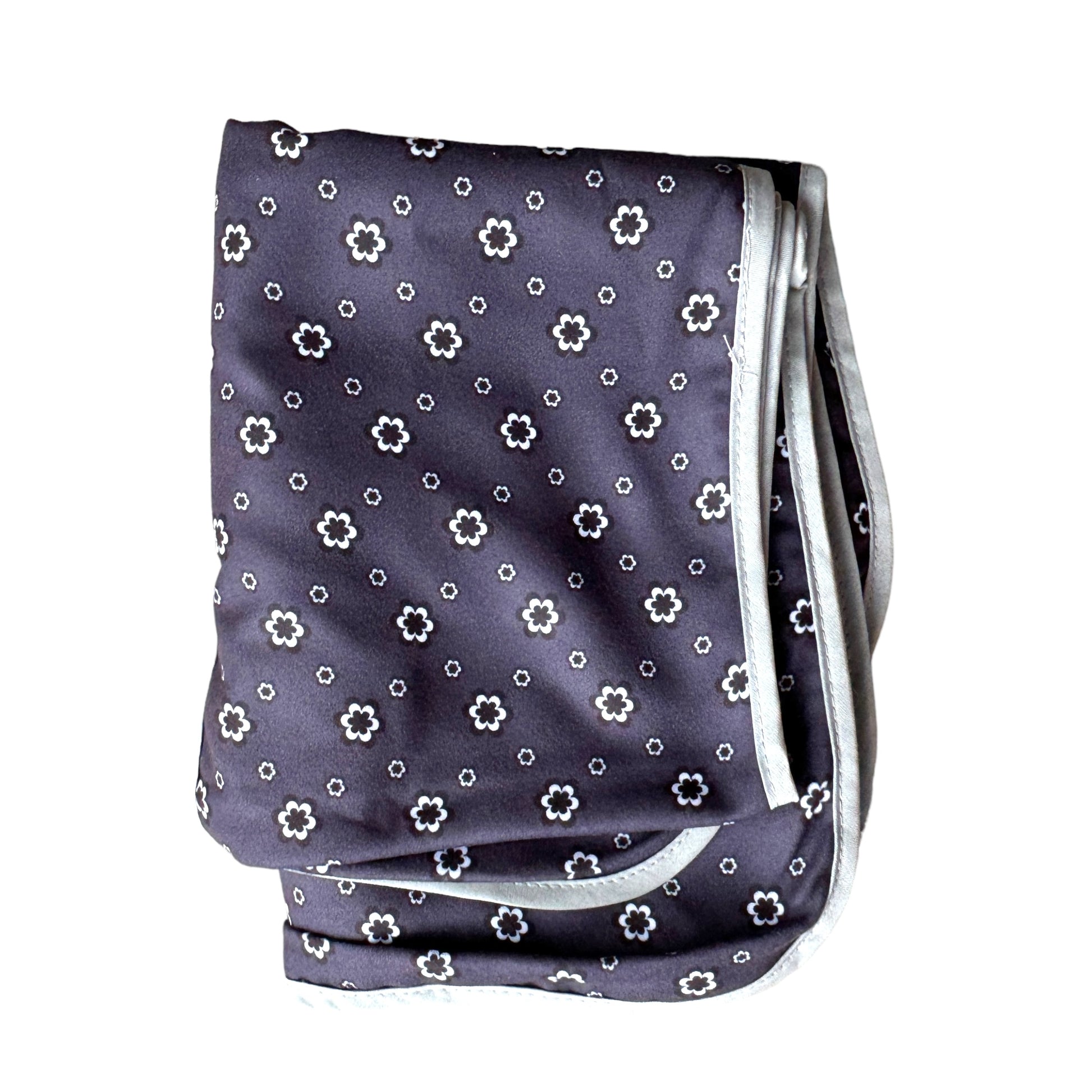Image Description: A navy blue background with a frequently repeating flower in two sizes between each other. The flowers are printed in black and white. This is a unisex material. It is a two layered scarf with a grey binding around the outside of the entire scarf.