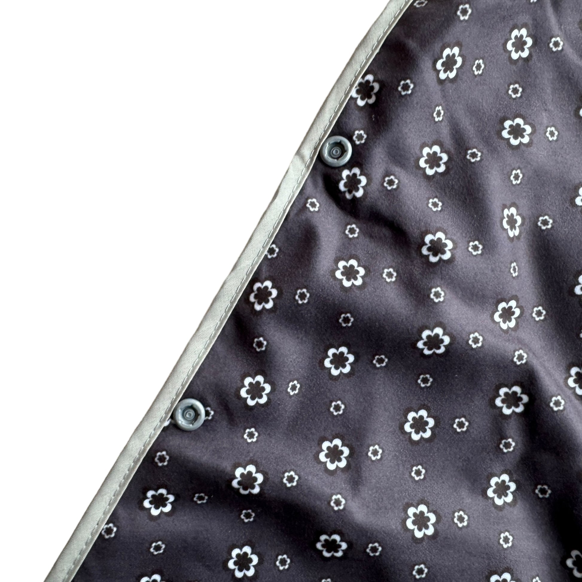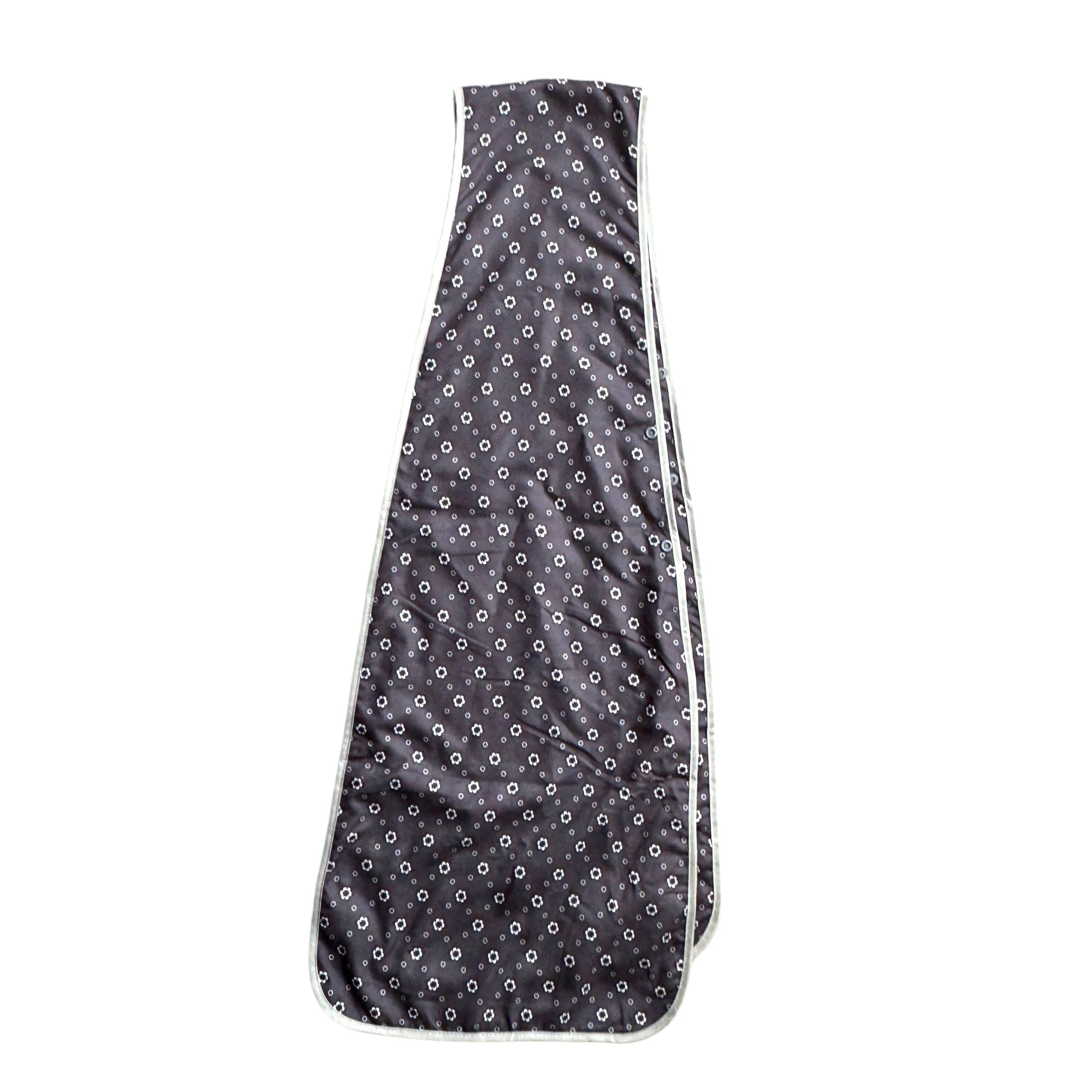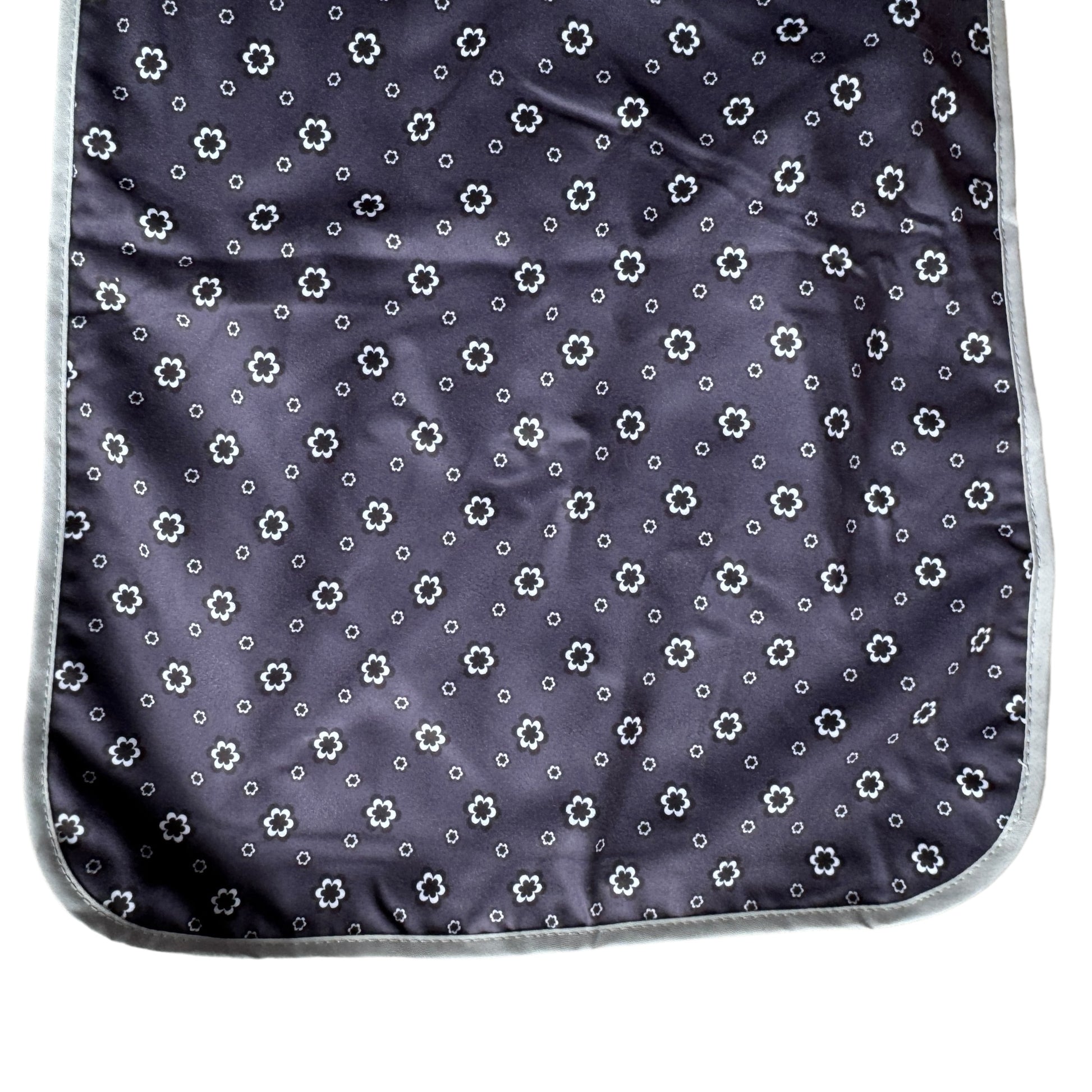 Image Description: A navy blue background with a frequently repeating flower in two sizes between each other. The flowers are printed in black and white. This is a unisex material. It is a two layered scarf with a grey binding around the outside of the entire scarf.