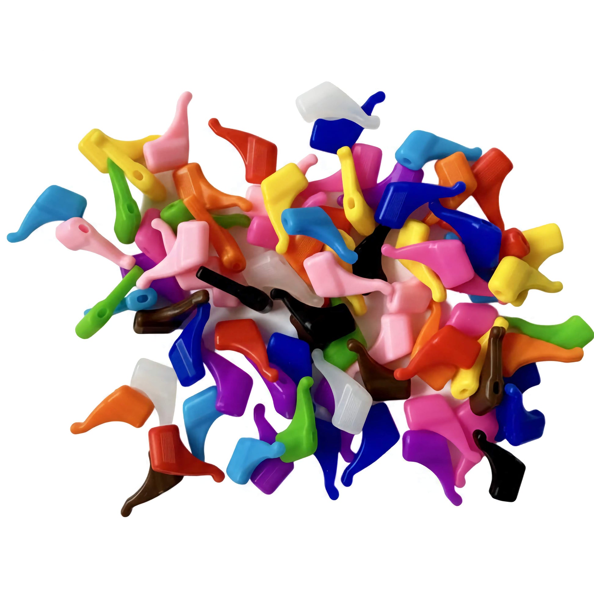 Image Description: Silicone ear hooks designed to slide onto the arms of glasses to help keep them securely in place. The hooks are shown on their own against a plain background, attached to glasses arms, and being worn behind the ear. Photos include different sizes and colours, demonstrating how the hooks sit comfortably and discreetly behind the ear.