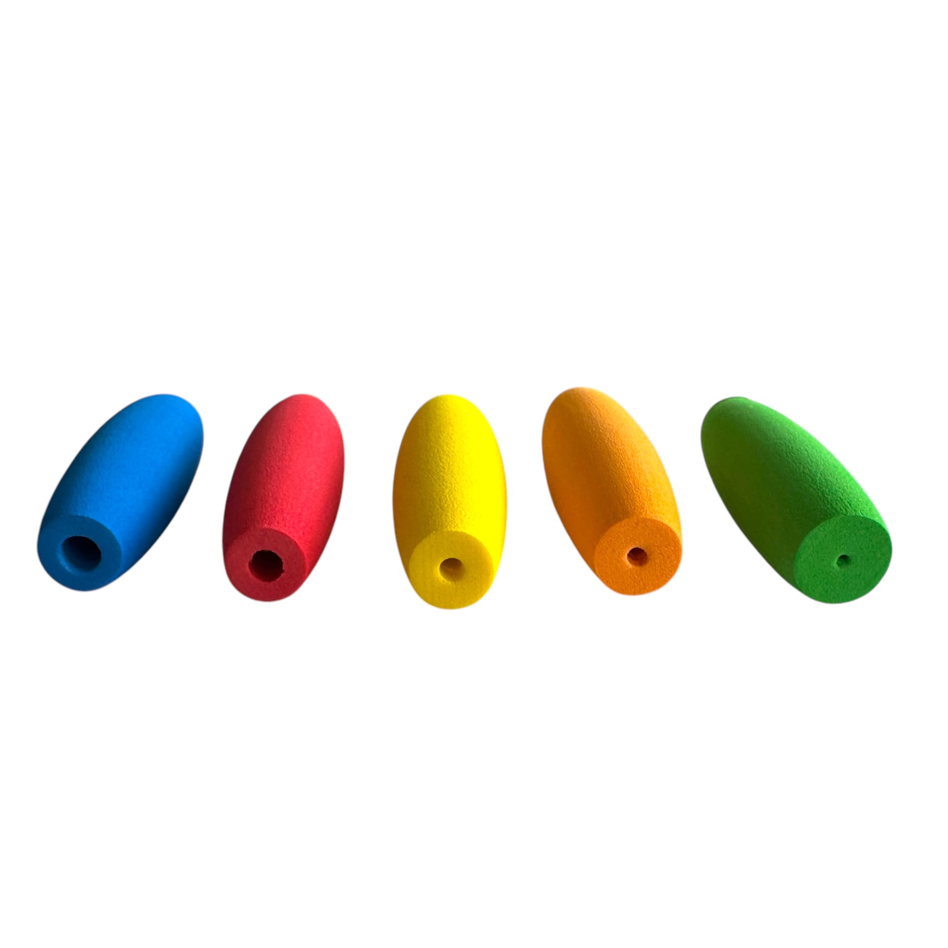 Image Description: Five colourful foam grips are shown in green, orange, yellow, red, and blue. Each shaped like a smooth, slightly textured cylinder with a hole through the centre. Photos also show the grips with a crochet hook and how they help hold the hook.