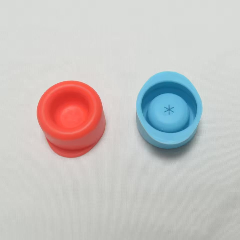 Image Description: A soft, stretchy silicone lid that fits over a drink bottle. It has a cross-slit in the centre for a straw, helping prevent spills. Shown in bright colours like red, blue, green, and yellow.