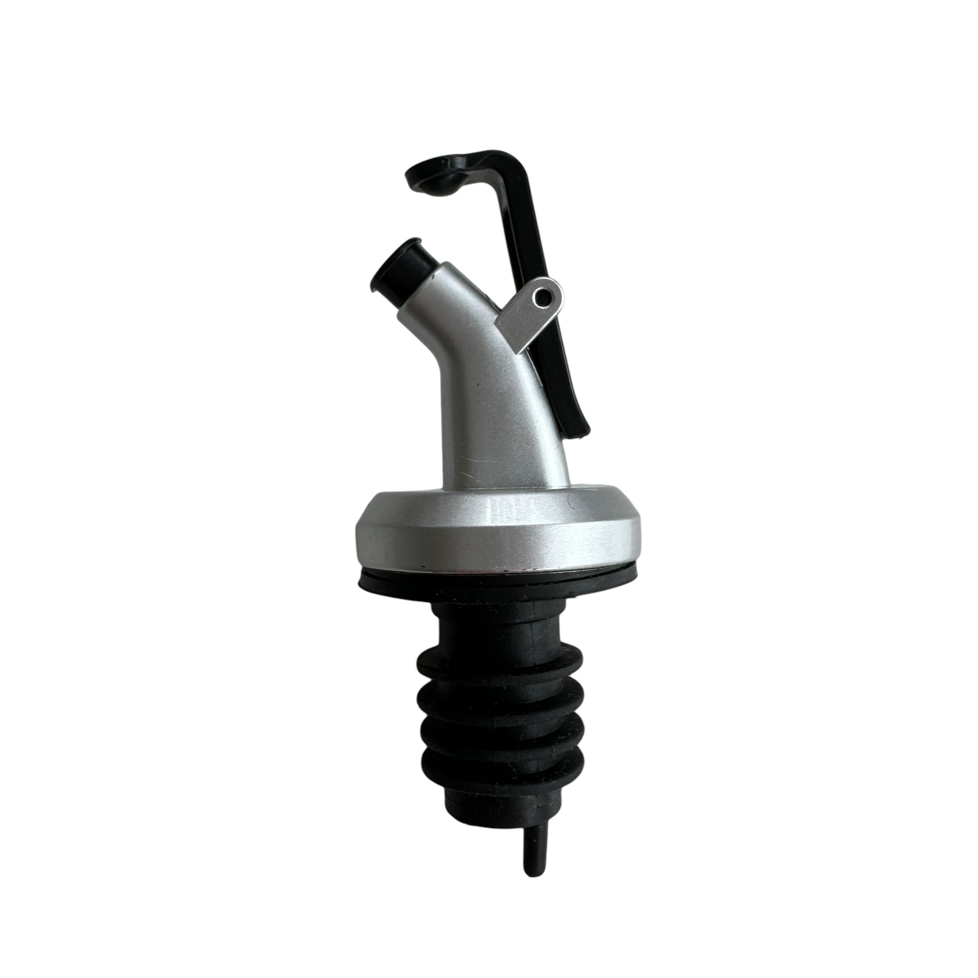 Image Description: A small bottle stopper with a black rubber base and a curved silver spout. It features a flip-top lid on the tip to control pouring and keep contents fresh. Designed to fit into glass bottles for easy, mess-free dispensing of oils, sauces, and dressings.