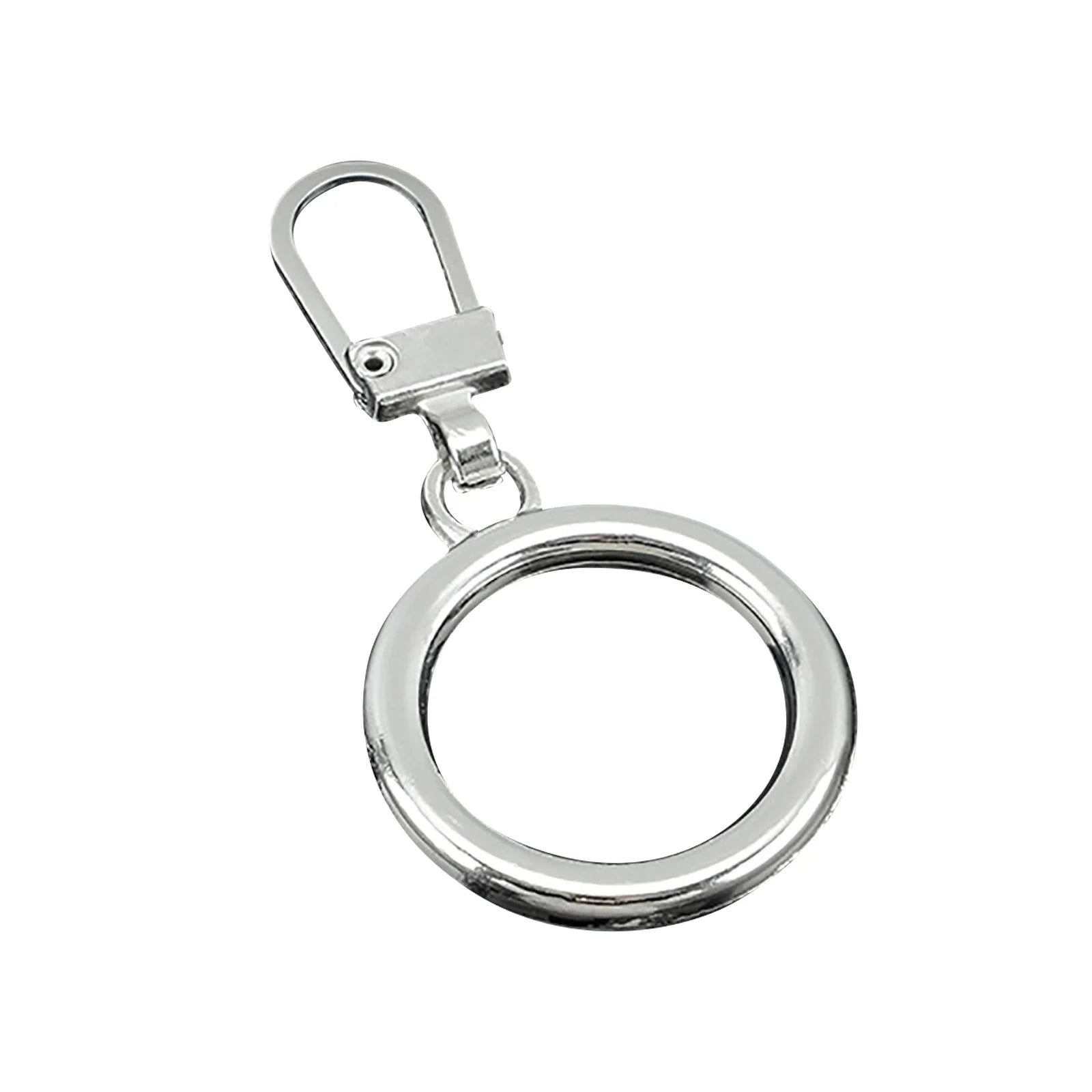 Image Description: Metal coloured clip-on zipper pulls with a circular ring, shown attached to jacket and bag zippers. The ring is large enough to grip easily or loop a finger through for added control.