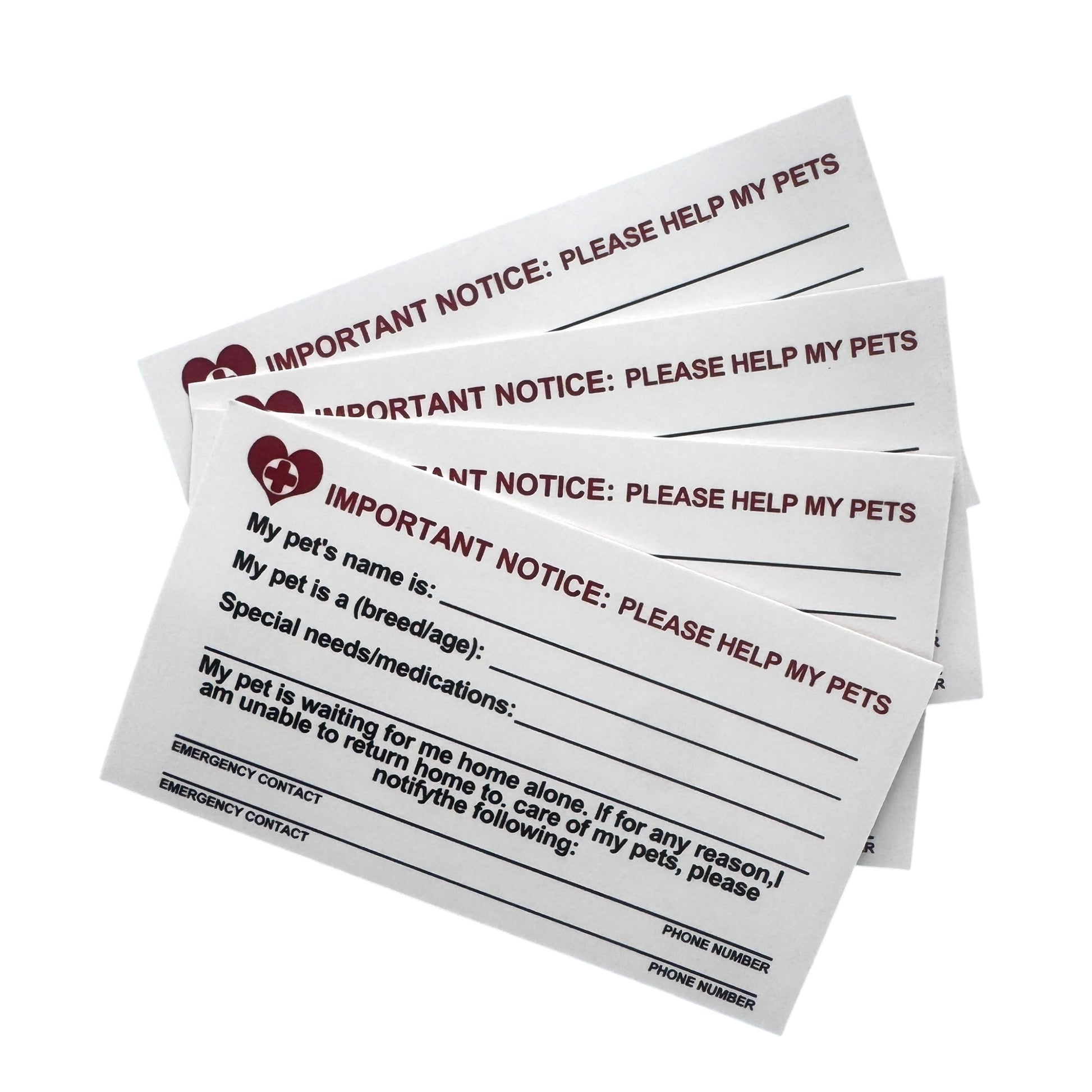 Back of card: A white background with black text and clear marked spaces to fill in important details. The top of the card reads, “IMPORTANT NOTICE: PLEASE HELP MY PETS.” Below are labeled fields to write your pet’s name, breed/age, medical needs or medications, and the names and phone numbers of two emergency contacts. There is also a short message that reads, “IMPORTANT NOTICE: PLEASE HELP MY PETS. If I become ill or injured and am unable to return home, please contact the people listed below as soon as possible. My pet(s) are home alone and need care.”