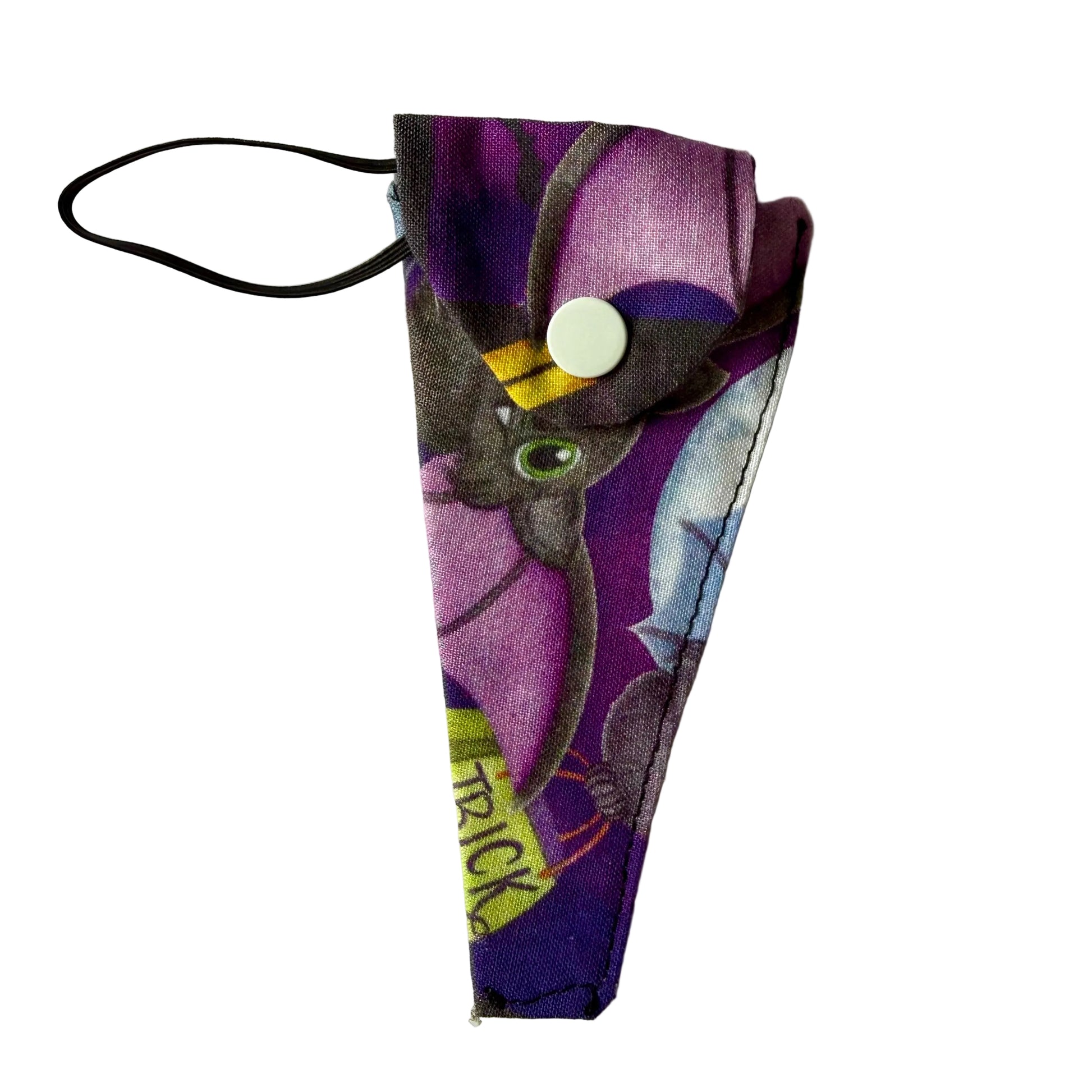 Image description: A neatly sewn cotton scissor cover shown flat on a surface. The cover is shaped to fit standard medical scissors, with fun patterns and designs, each one is individual and a one-of-a-kind.