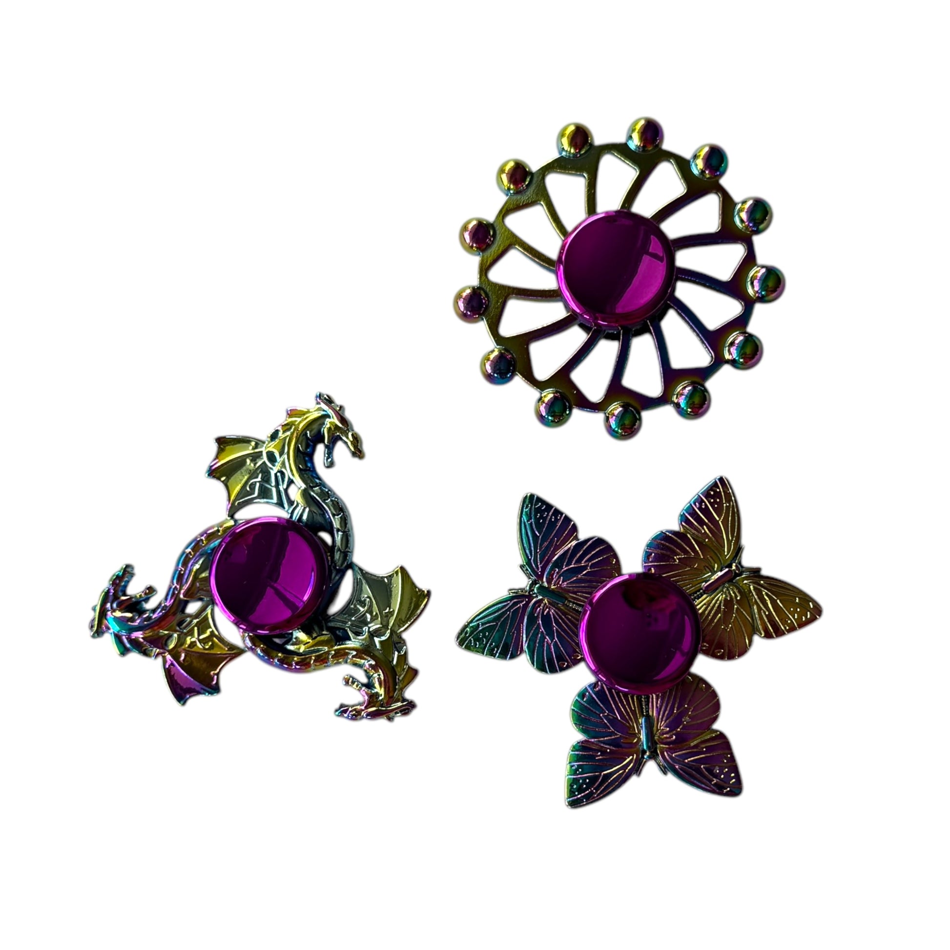 Image Description: A set of three metallic fidget spinners. The first features a butterfly shape with intricate wing details. The second spinner takes the form of a dragons around the centre of the spin, with sharp, bold lines. The third is a wheel design, taking shape as a Ferris wheel, or floral pattern. They all have a smooth, shiny metallic vibrant and iridescent finish.