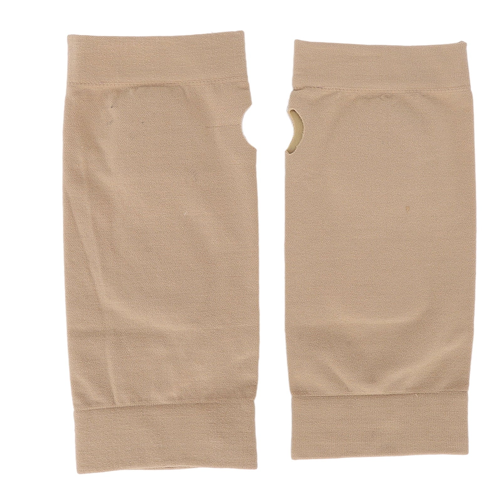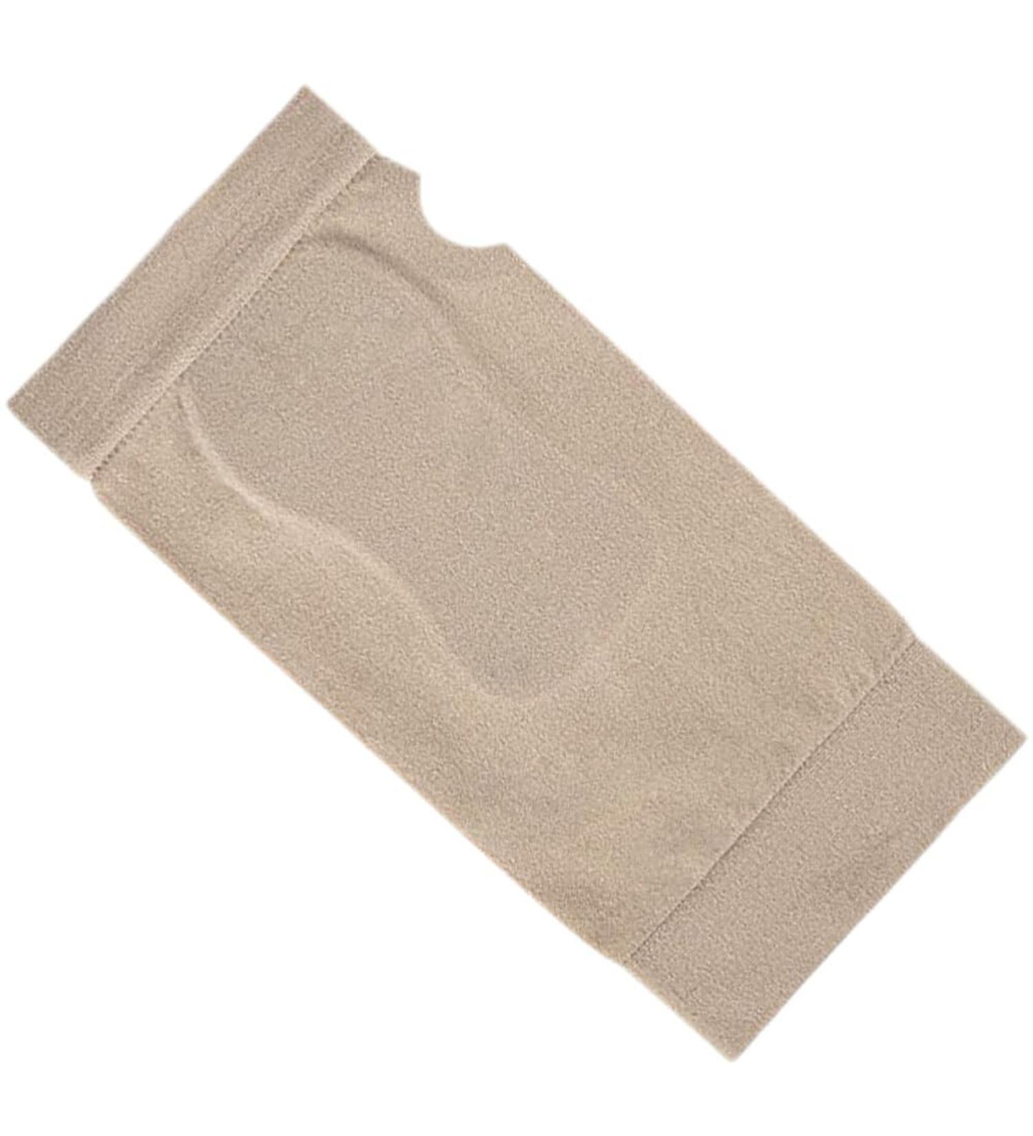 Image Description: Beige wrist sleeves with a built-in gel pad positioned at the base of the palm. The sleeves are shown worn on a hand and laid flat to display the cushioned support area.