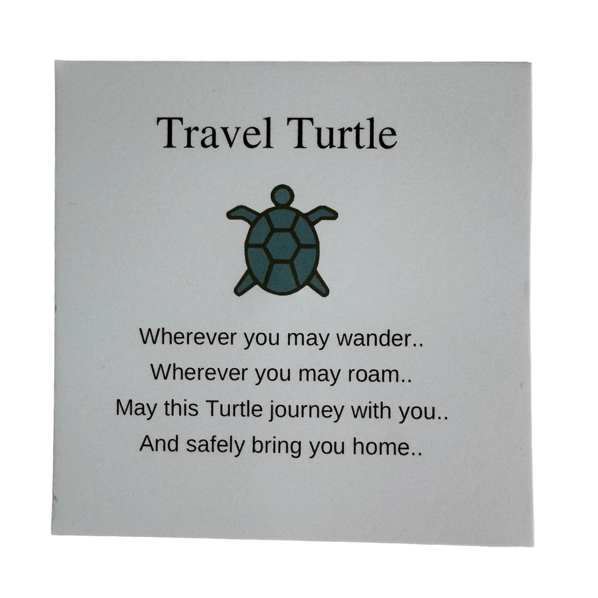 Image Description: A turquoise turtle keychain with a silver clasp is displayed alongside a card that reads: "Travel Turtle. Wherever you may wander.. Wherever you may roam.. May this Turtle journey with you.. And safely bring you home.." The card features an illustration of a turtle above the text, enhancing the travel-themed design. The keychain and card together make a meaningful and protective travel accessory.