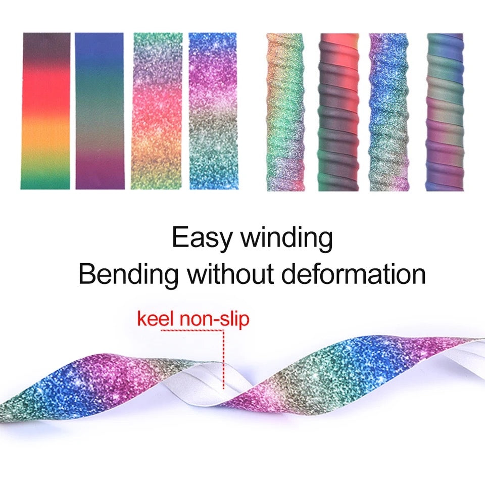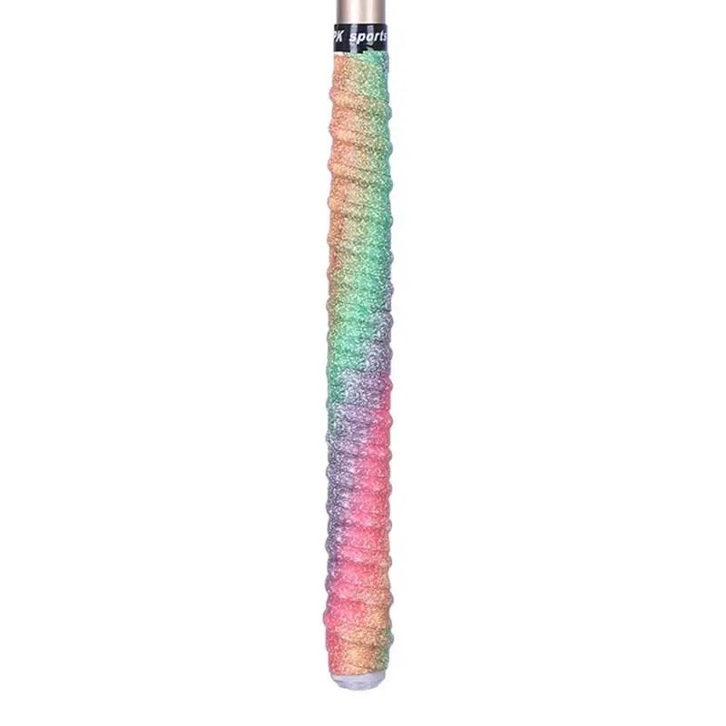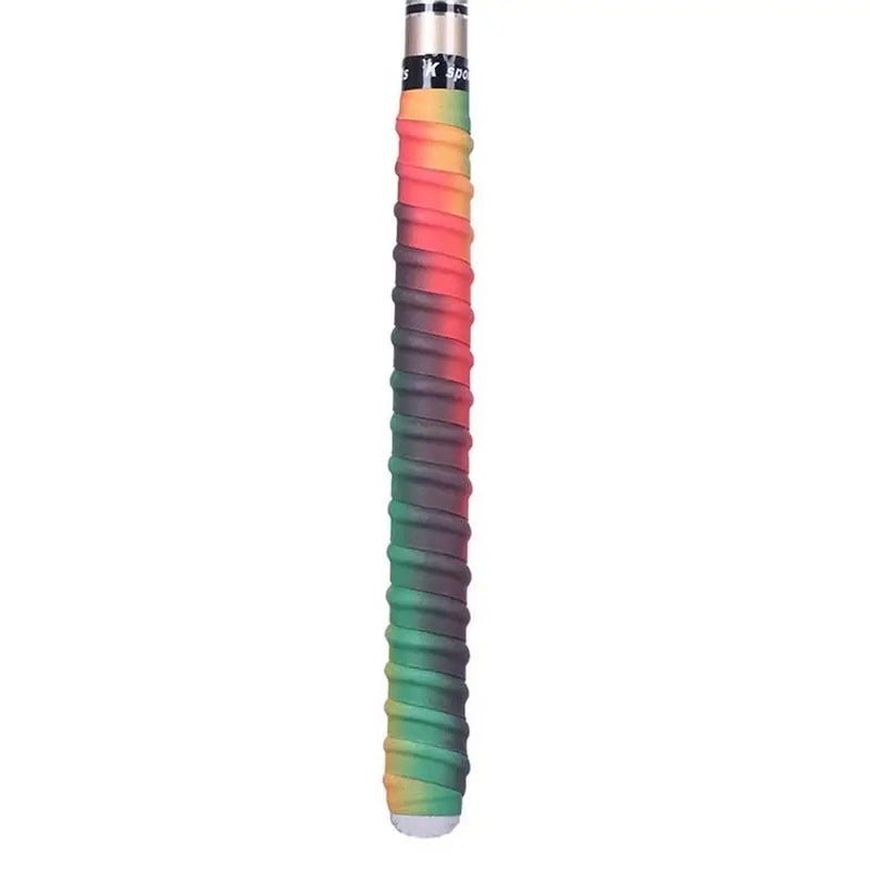 Image description: A handle wrapped with soft, ridged grip tape in a gradient of green, yellow, and red. Part of the tape is shown unwrapped to demonstrate how easily it winds around the handle.