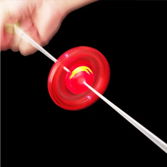Just loop your finger through the yellow hoops and spin the flywheel at high speed until the string is tightly wound, then pull the strings tightly and watch the flywheel light up emitting a colourful halo of light accompanied by a high whistle. Pull the loops as it unwinds to spin the flywheel at high speed again. The effect is better at night, but still enjoyable at any time!