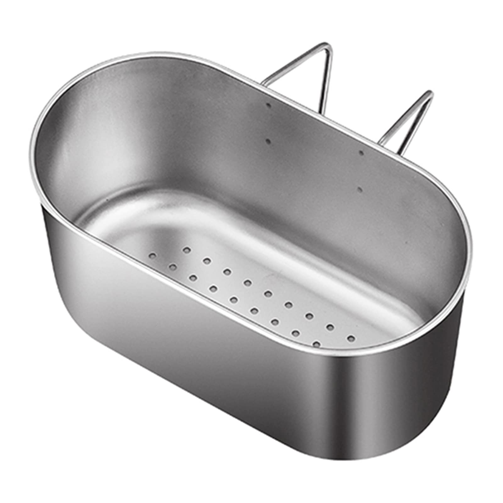 Image Description: A stainless steel sink basket clipped onto the side of a kitchen sink. It holds food scraps and has small drain holes in the base so water can drain through. Some images show it used for washing vegetables, catching scraps, and storing sponges.