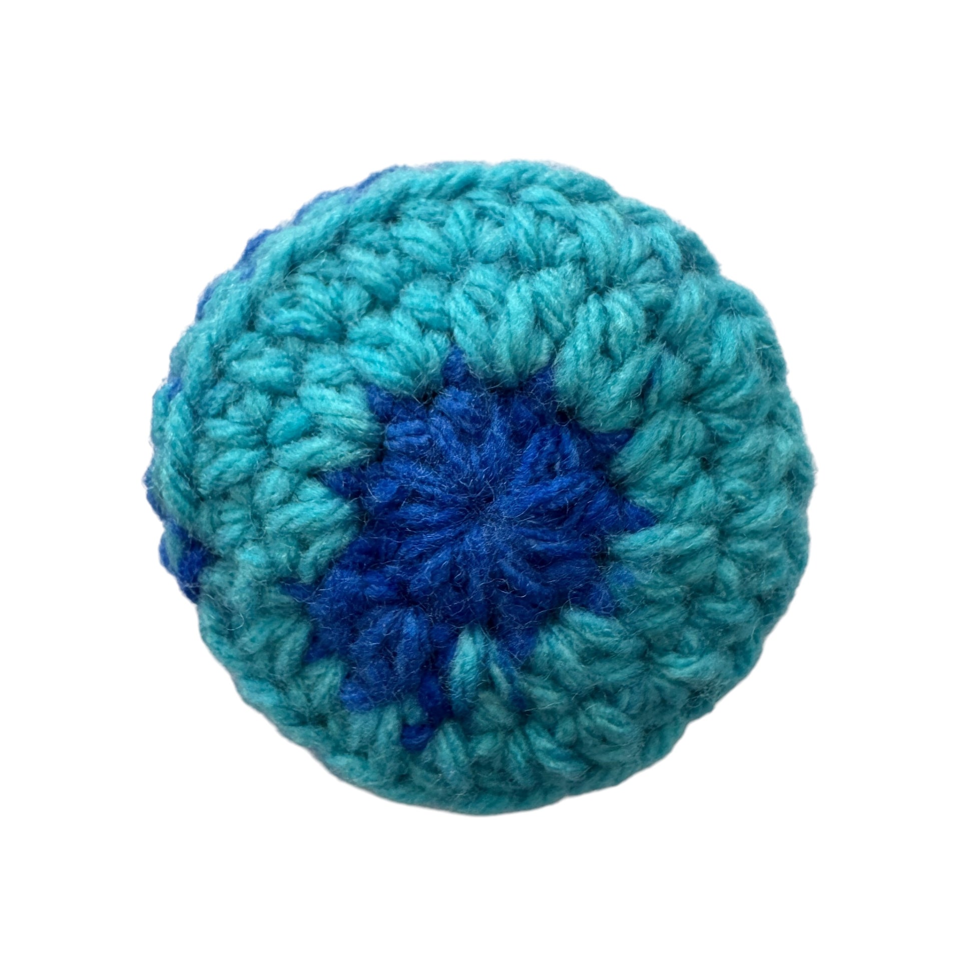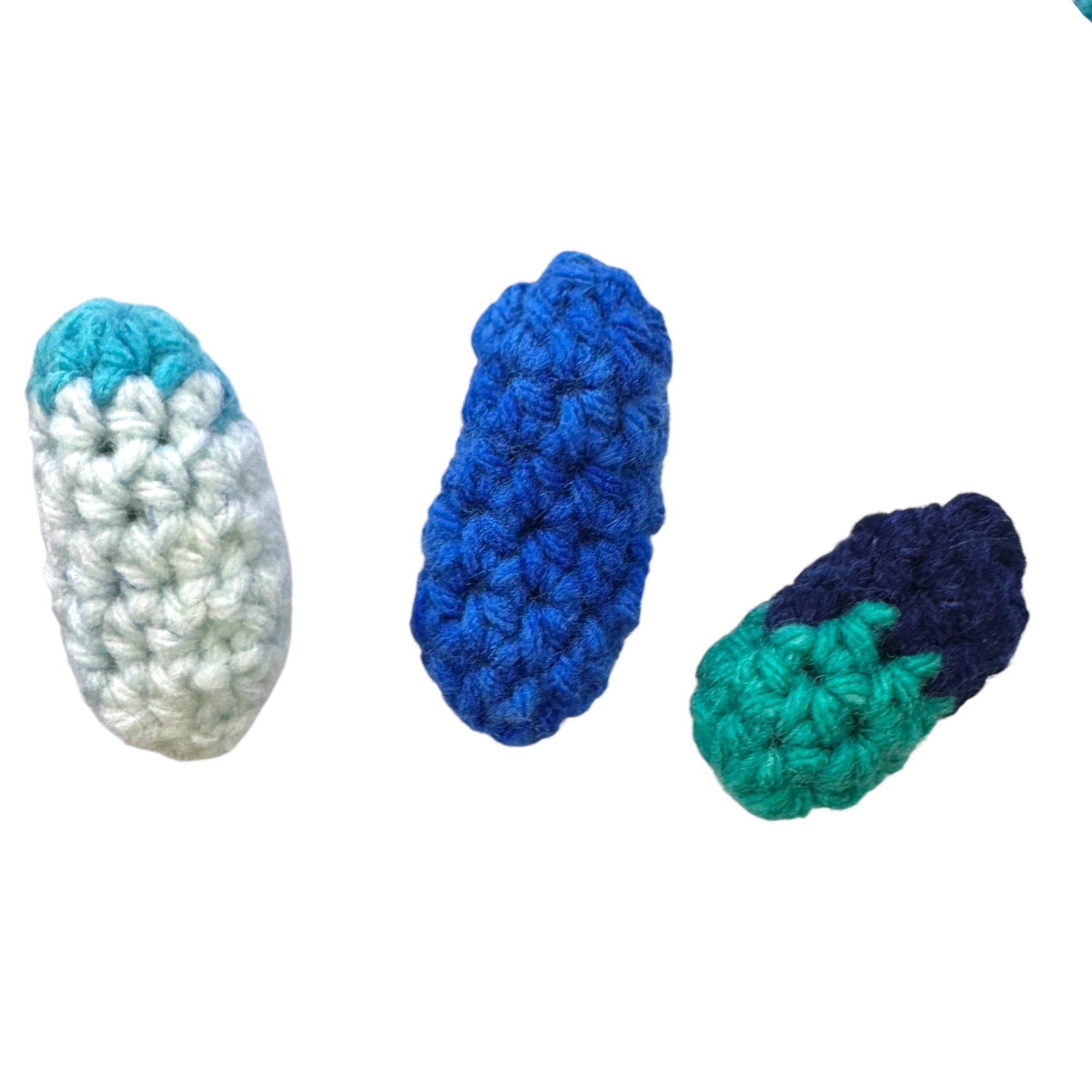 Image description: Small, round crochet fidgets in shades of blue and white, each containing a marble inside. The marble moves smoothly within the crochet, providing a calming sensory experience.