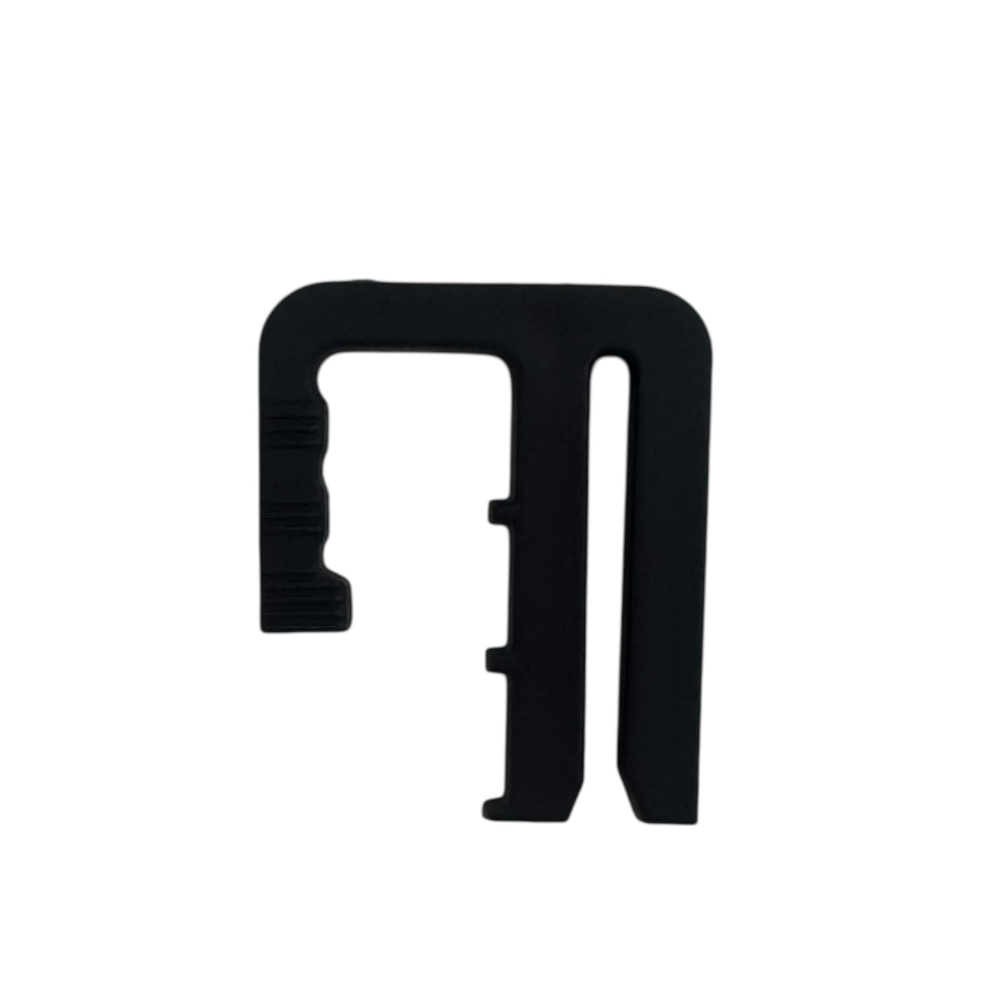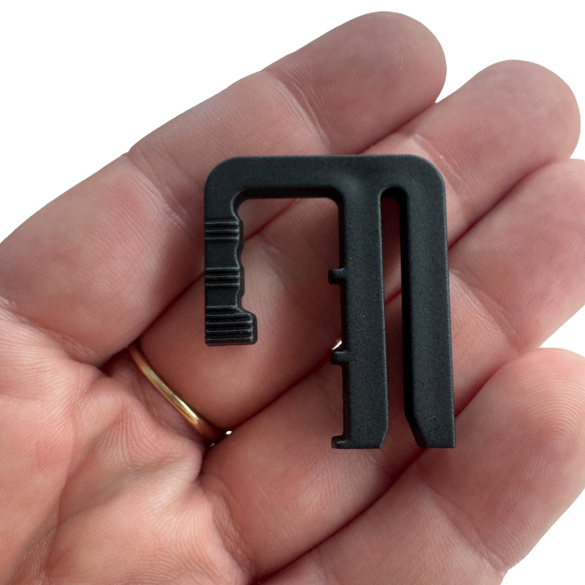 Image Description: This small black plastic clip is shown both on its own and being used on a pair of jeans. It’s shaped like an angled hook with notches along the inner edge. In the images, the clip is slid onto the waistband of denim jeans to gather and tighten the fabric, helping reduce a loose fit at the waist. One image shows it clipped on while being worn, sitting flat and discreet under a shirt. Another shows it being attached by hand, demonstrating how the clip grips the fabric to cinch the waistband.