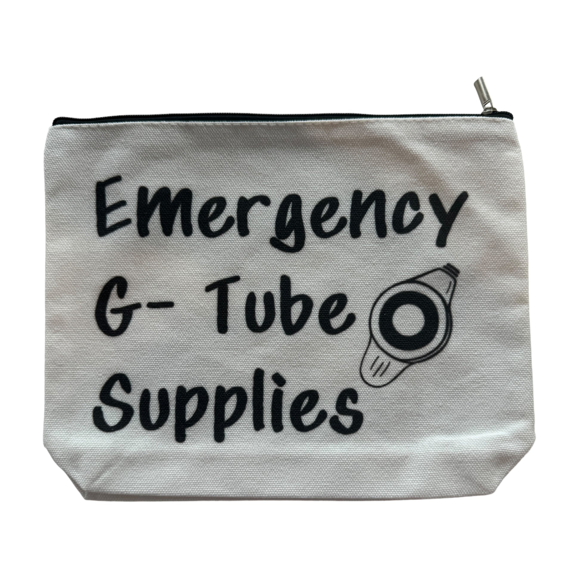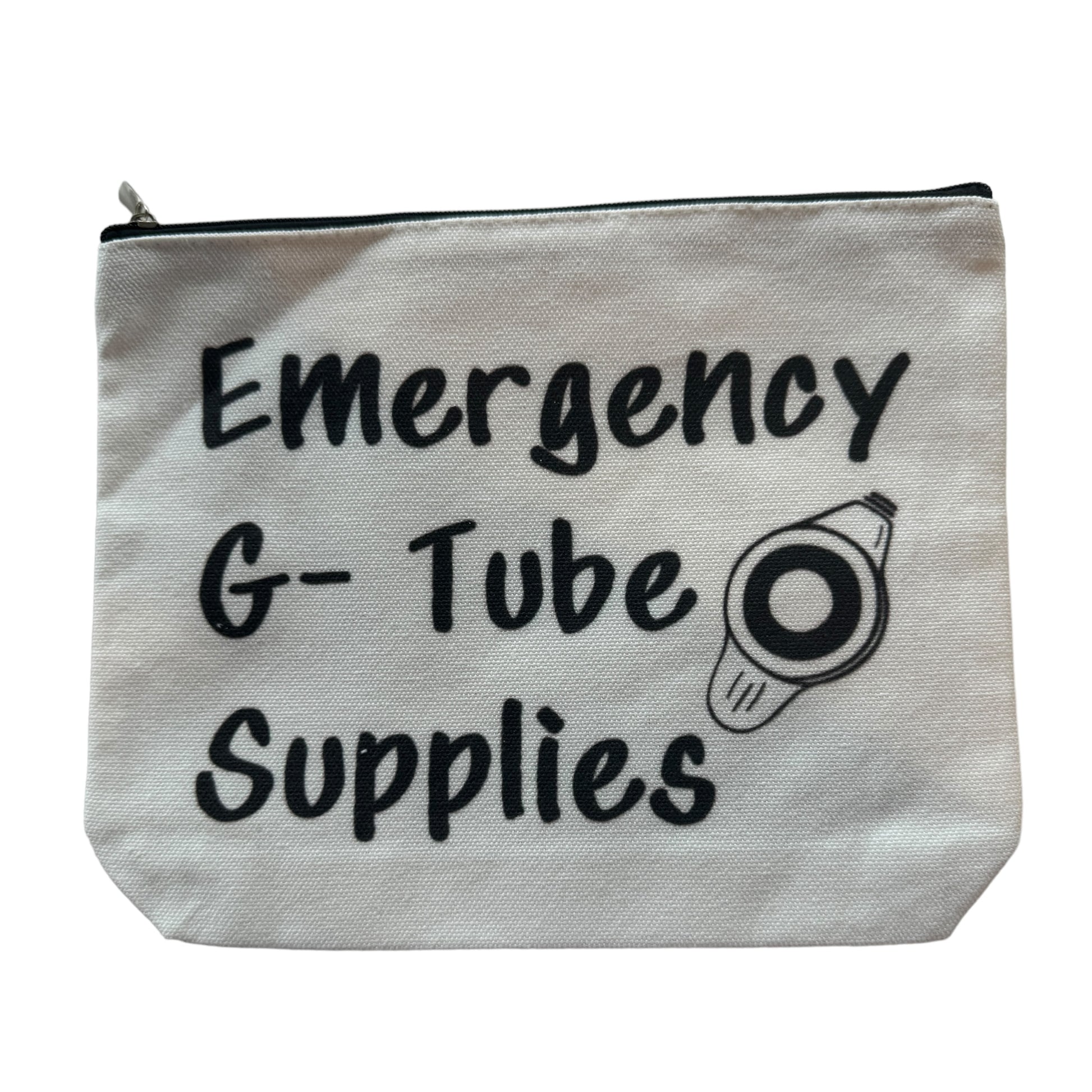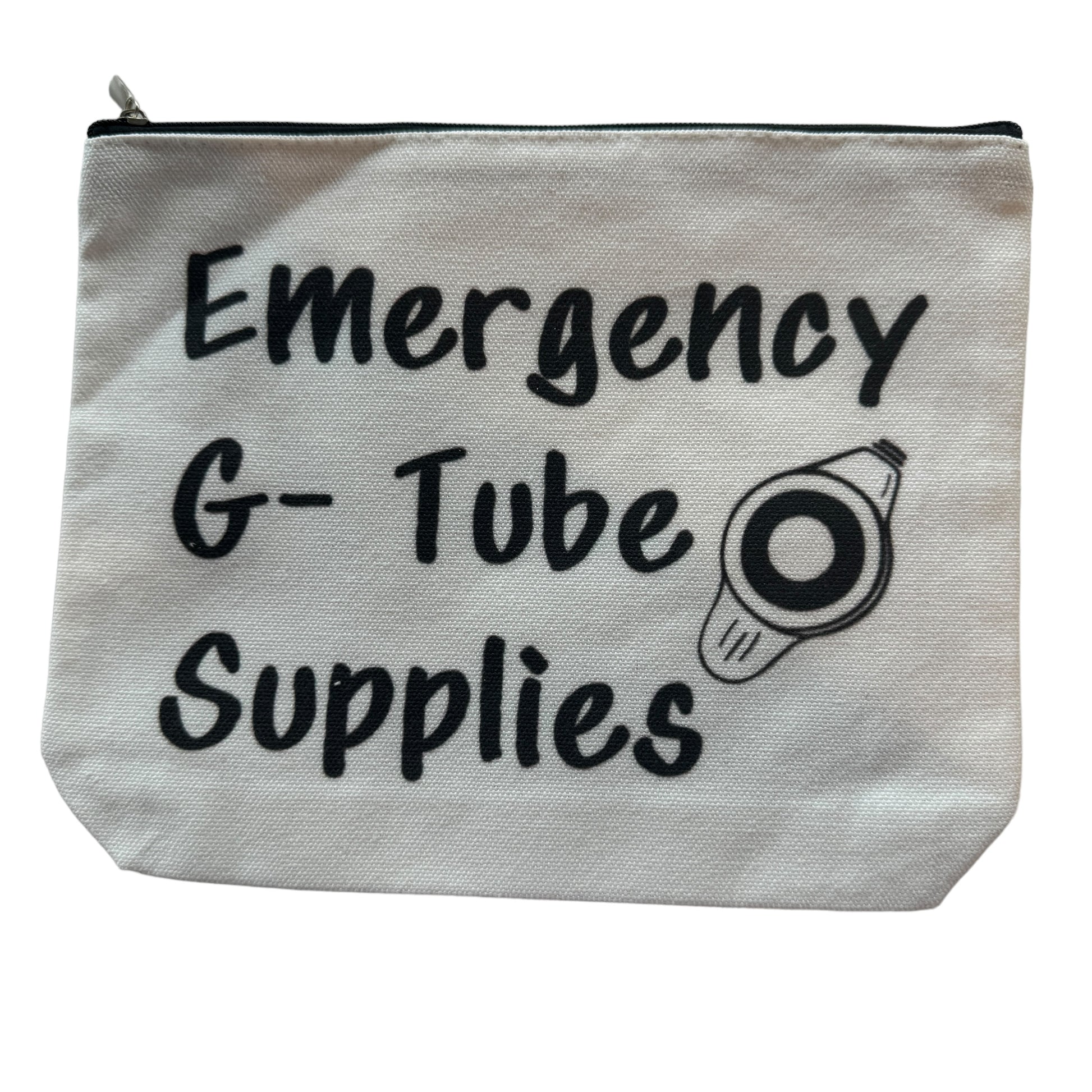 Image Description: The image shows a rectangular white fabric case with the words "Emergency G-Tube Supplies" printed in bold black text on the front. The design includes a small graphic of a G-Tube beside the text. The case has a zipper closure at the top, with the black text and simple illustration standing out clearly against the white background.