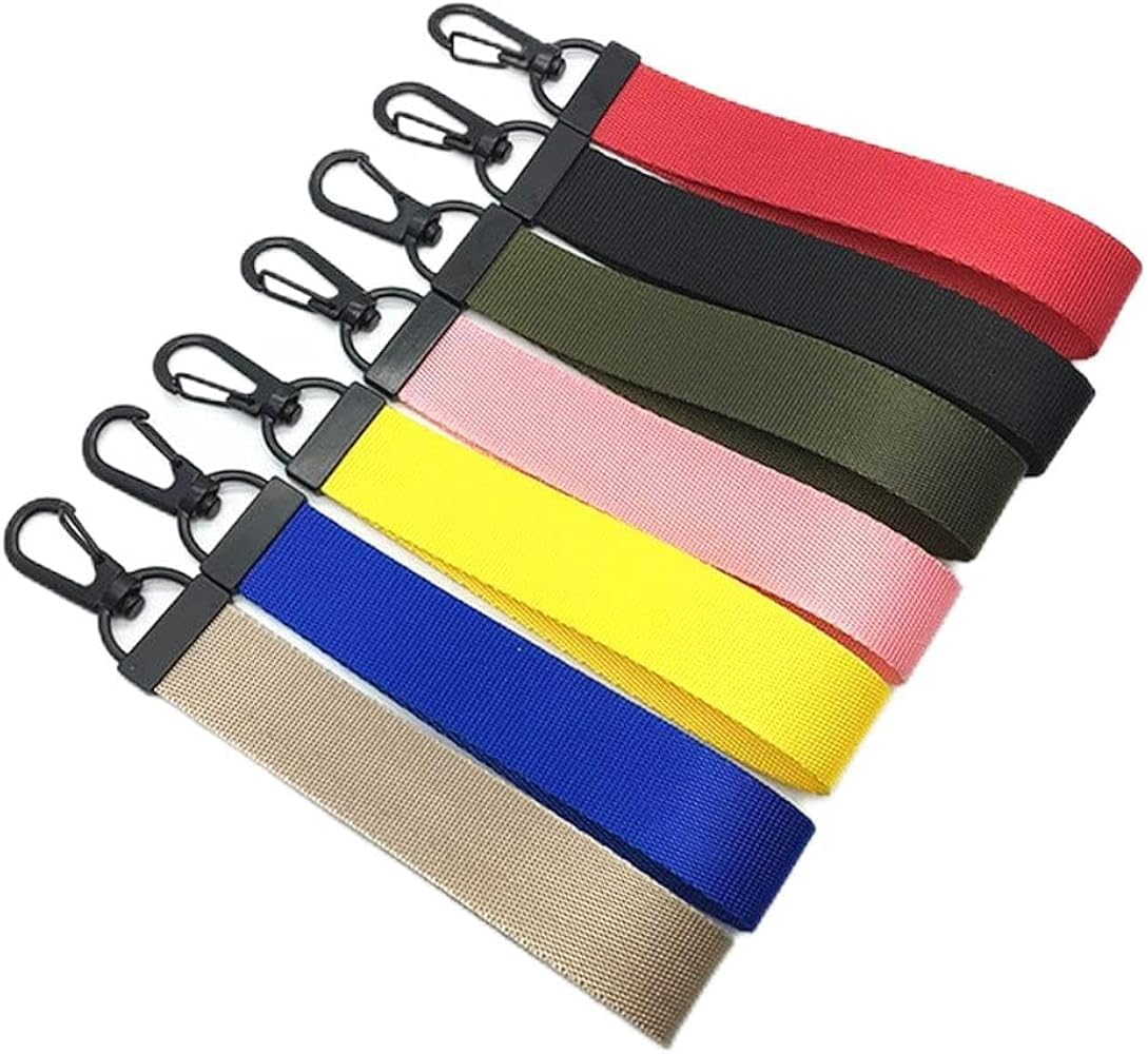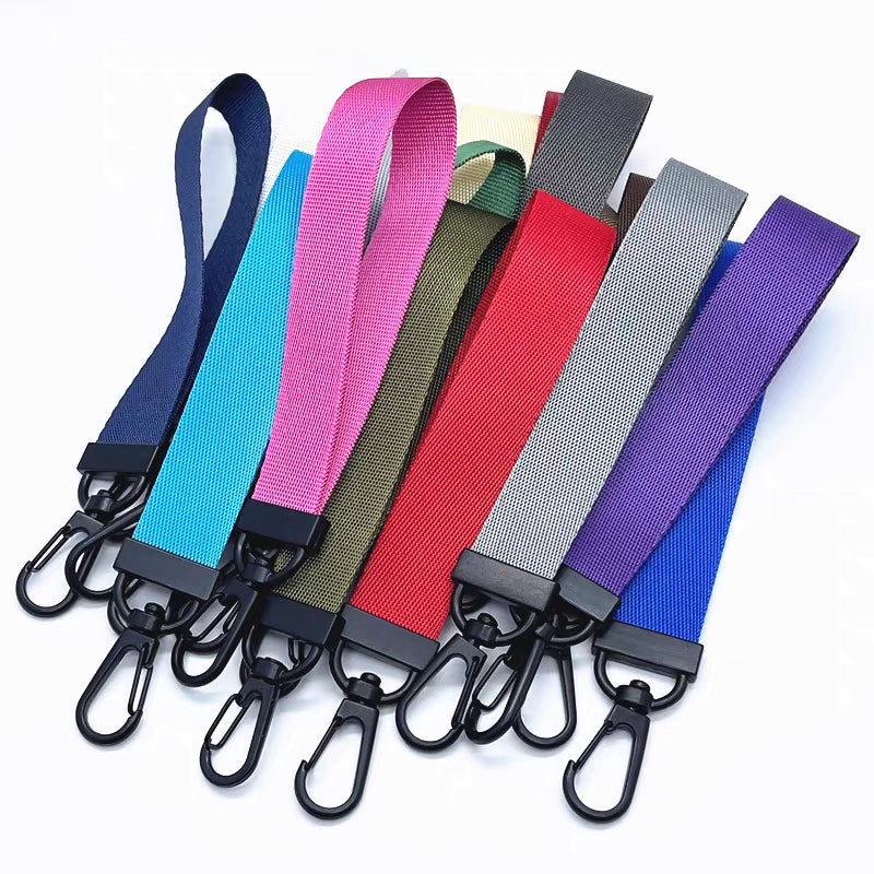 Image Description: A collection of fabric wrist lanyards in assorted colours, each with a black metal clip attached at one end. The lanyards are laid out side by side, showing the range of colour options and the simple loop-and-clip design.