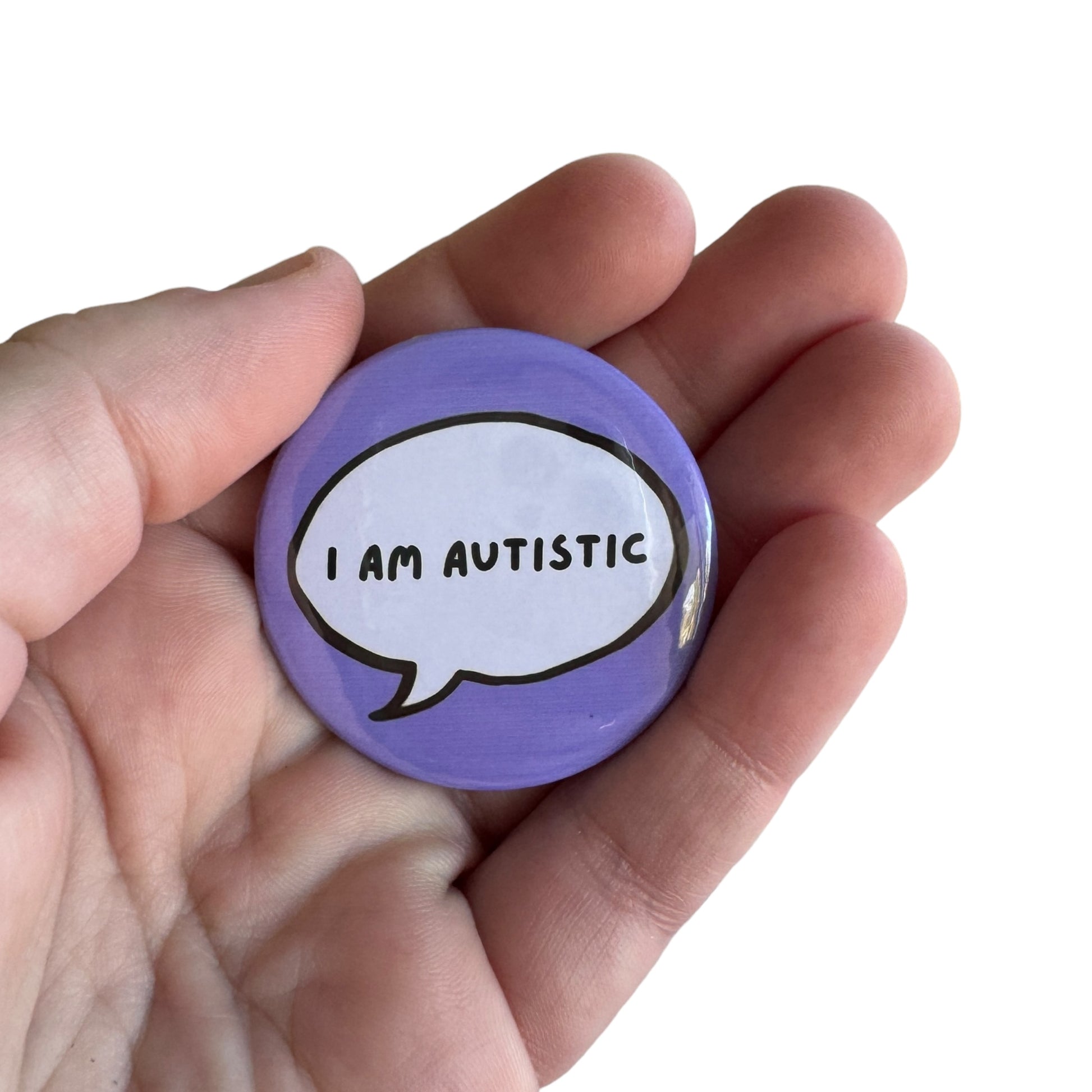Image Description: This pin is based on a lilac purple background, and a white speech bubble with the words written inside in black print and in black outline, says “I Am Autistic”.