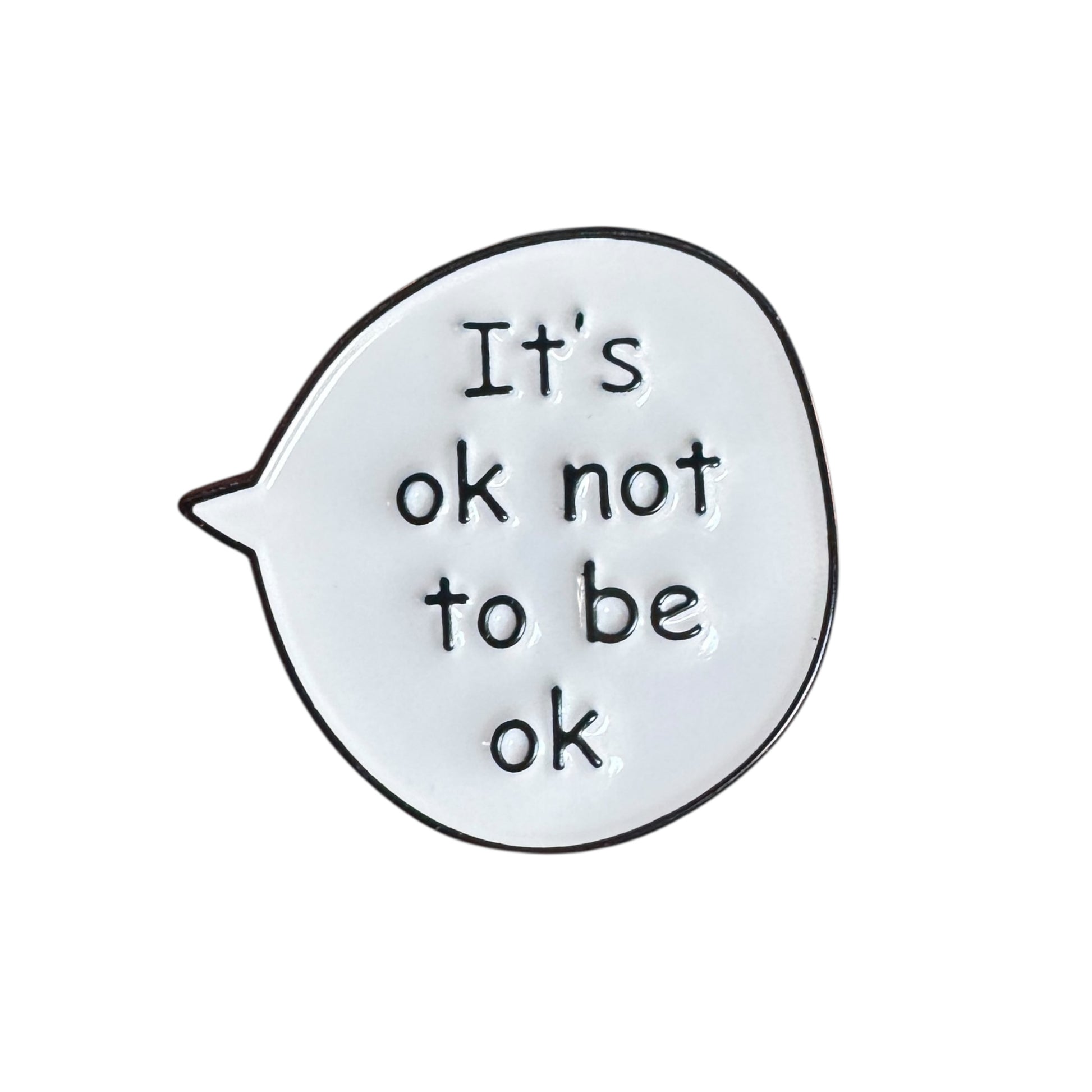 Image Description: A white enamel pin shaped like a speech bubble is held between someone’s fingers. It features black text that reads: “It’s ok not to be ok.” The message is spread across four short lines in a soft, rounded font. The background is plain, keeping the focus on the pin’s gentle, affirming message.