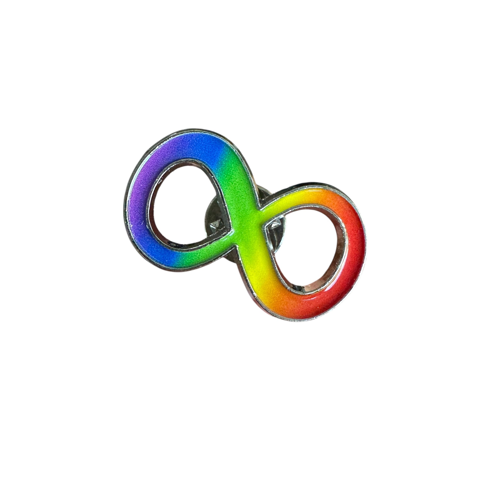 This infinity either rainbow pin raises awareness for the neurodiversity spectrum and the pride movement. Celebrate your loved ones with this awareness pin. An infinity eight pin with purple, blue, green, yellow, red.