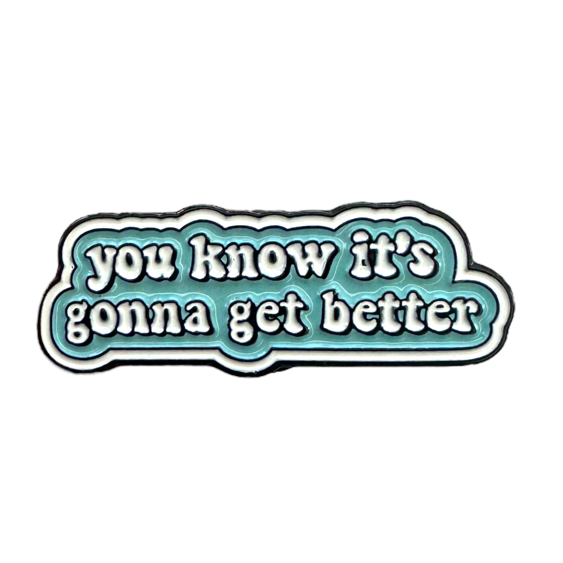Image Description: A teal enamel pin with the words you know it’s gonna get better written in bold white lettering, outlined in black.