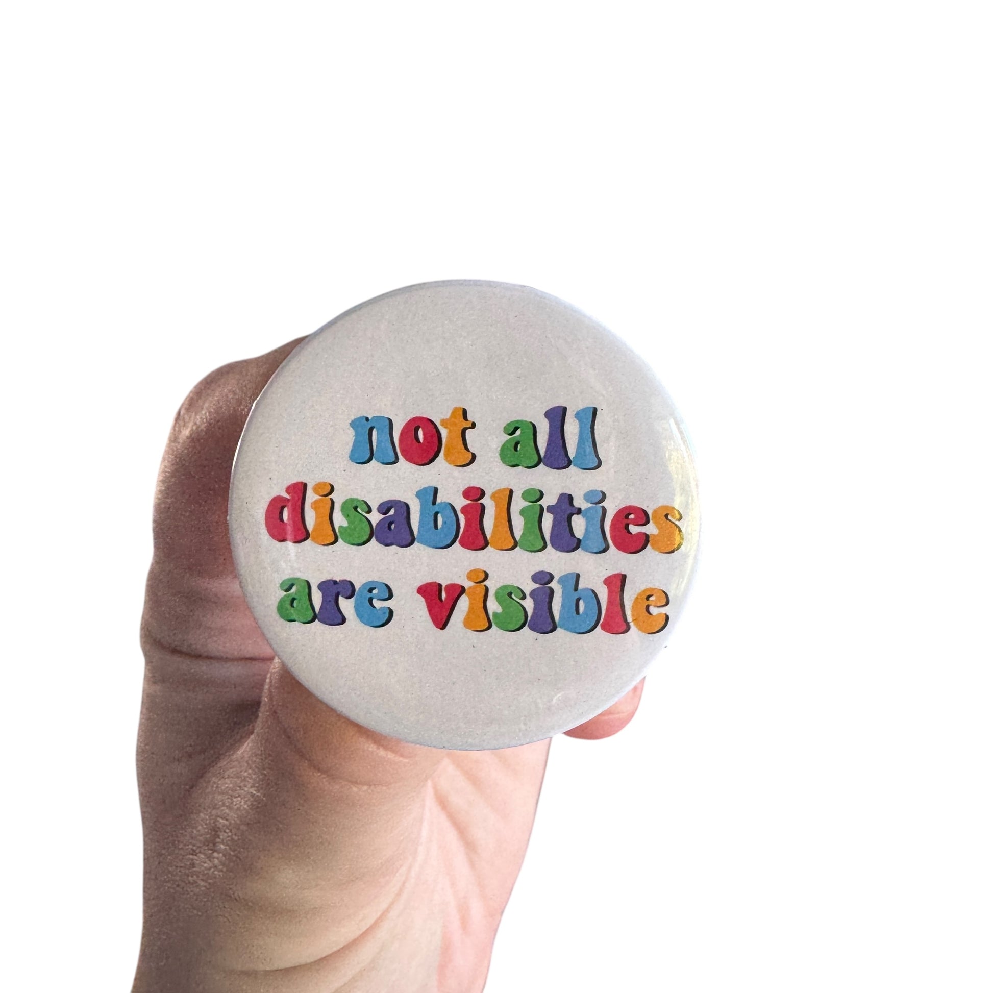 Image Description: A pin with a white background. The pin displays the phrase “not all disabilities are visible” in bright, playful, rainbow-coloured lowercase letters. Each letter varies in colour, including red, blue, yellow, green, orange, and purple.