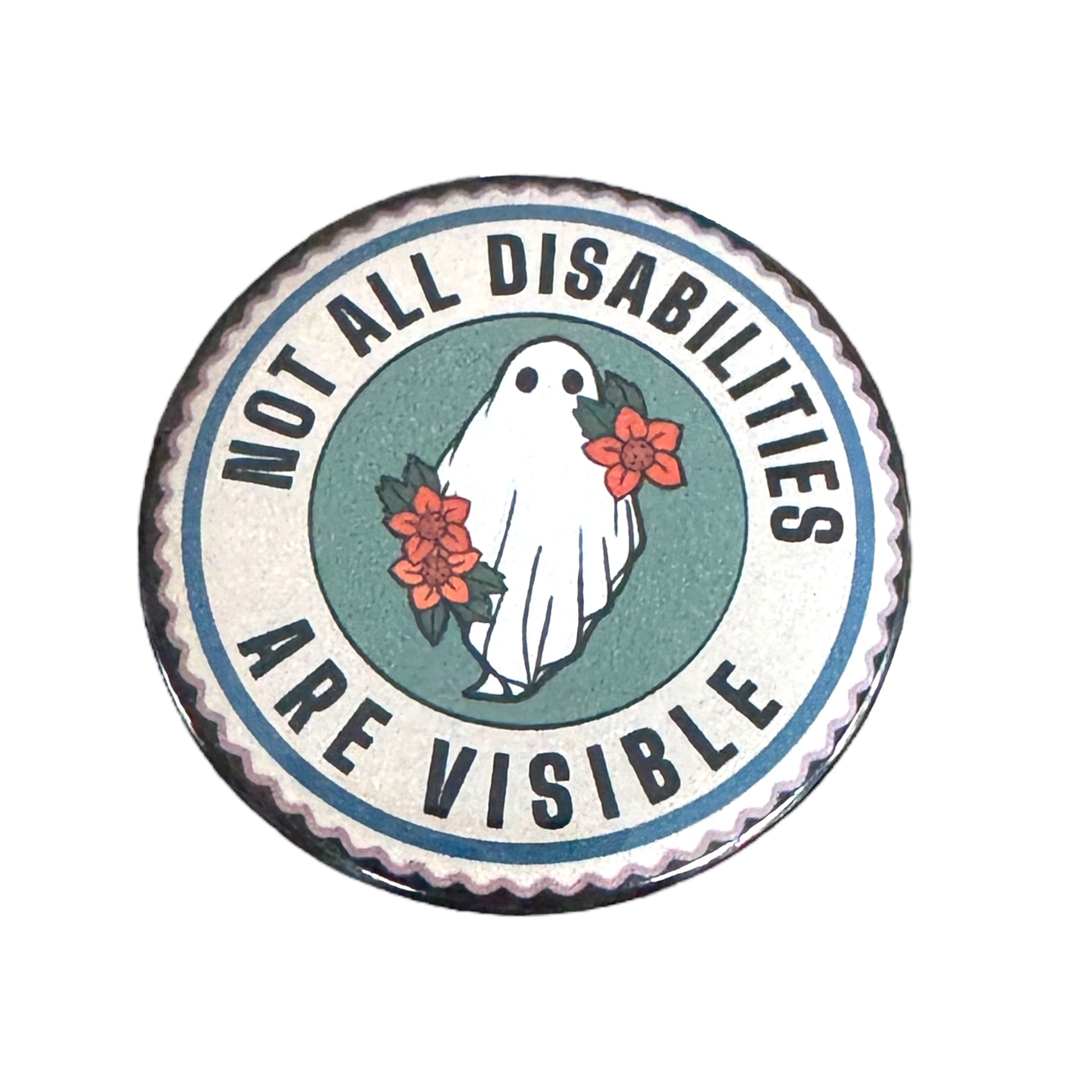 Image Description: The pin has a soft sage green and cream colour scheme with a circular border. In the center is a cartoon-style white ghost with two black eyes, surrounded by red-orange flowers and green leaves. Around the edge of the pin, bold black text reads: “Not All Disabilities Are Visible.” The design has a calm, vintage feel, and the image is brightly lit to show all details clearly.