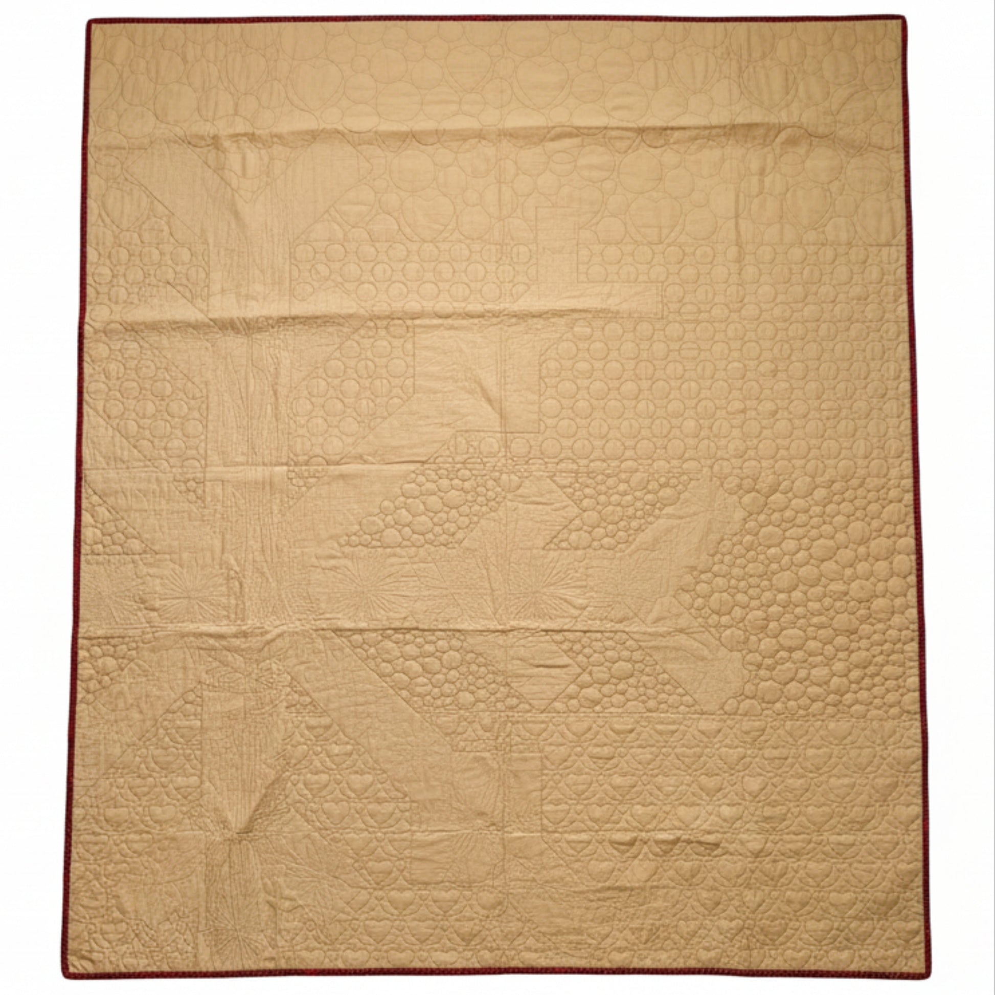 The contrast between the crisp white shapes and the deep red tones gives this quilt a sense of movement and energy, while the detailed quilting adds texture and depth when you look closer. It feels festive without being seasonal-only, making it a piece that can be enjoyed year-round.