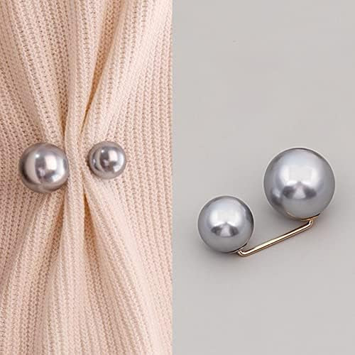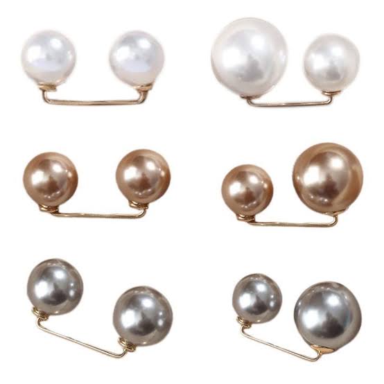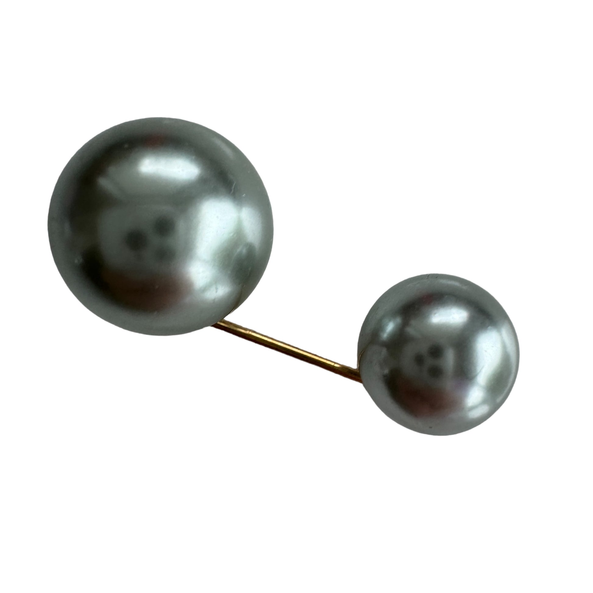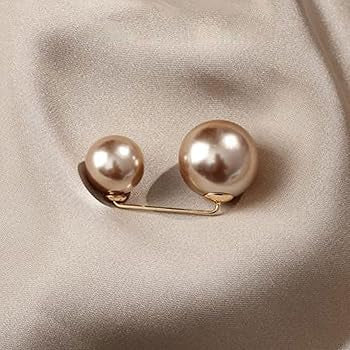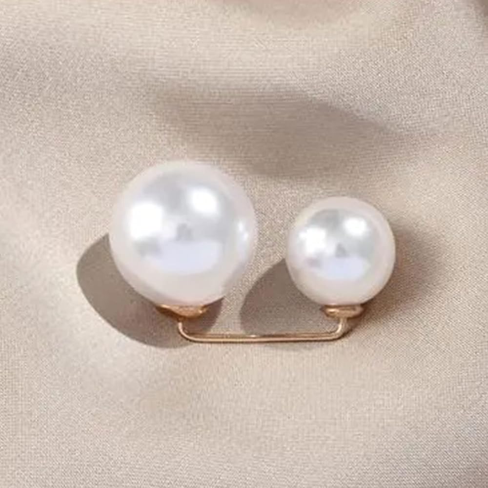 Image Description:  A clothing pin featuring two glossy faux pearls connected by a thin gold bar. One pearl is significantly larger than the other, creating a visually balanced design. The pin is compact and curved slightly, intended to slide through fabric for gathering or styling clothing.