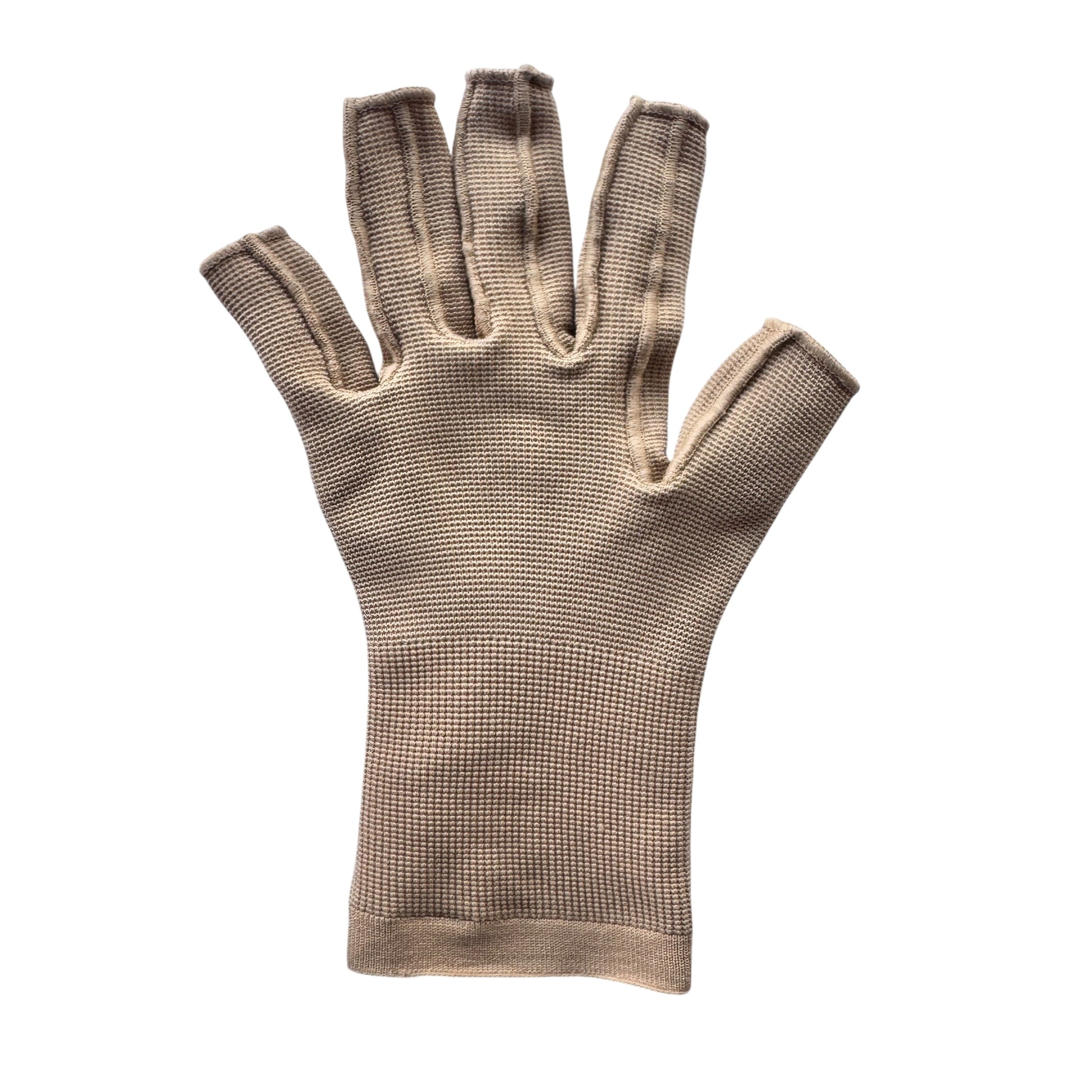 Image description: A beige seamless compression glove shown on a mannequin hand. It extends past the wrist and covers the palm and fingers, with open tips to allow movement. The material is smooth and snug, designed for firm compression and deep pressure support without seams.