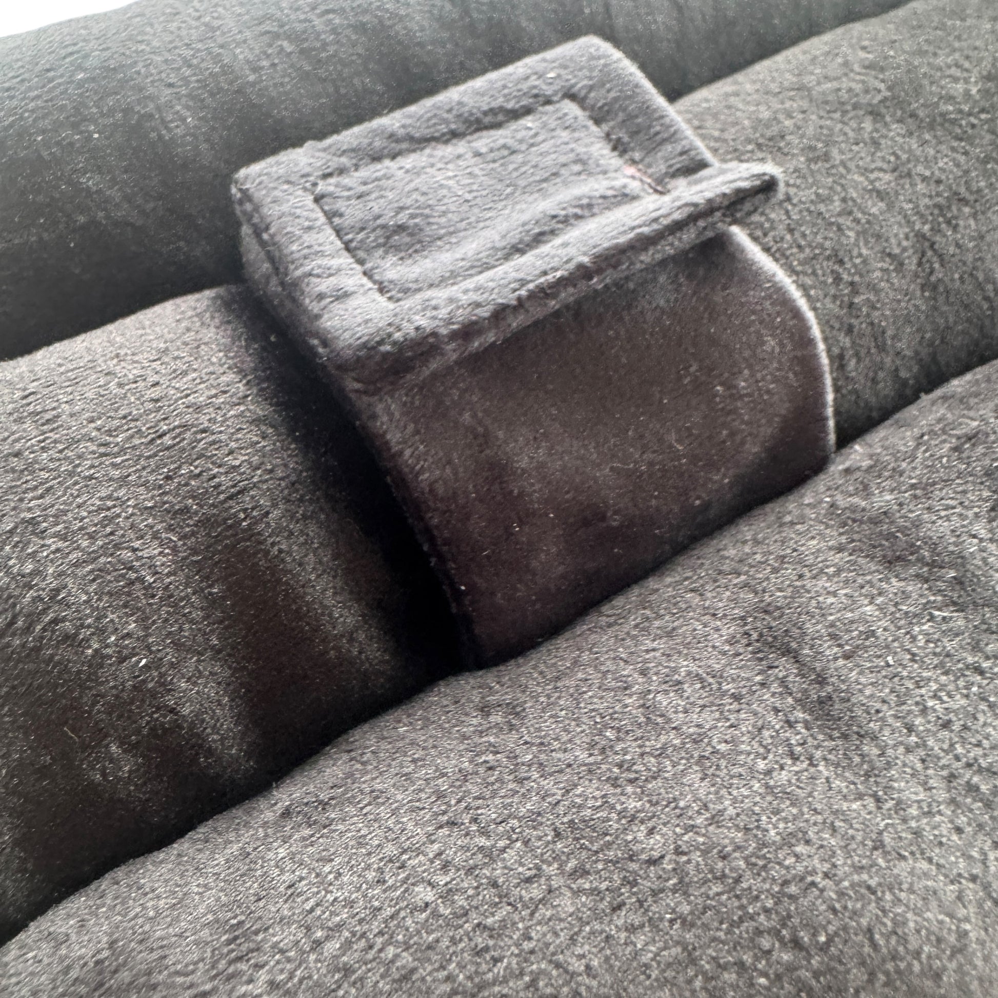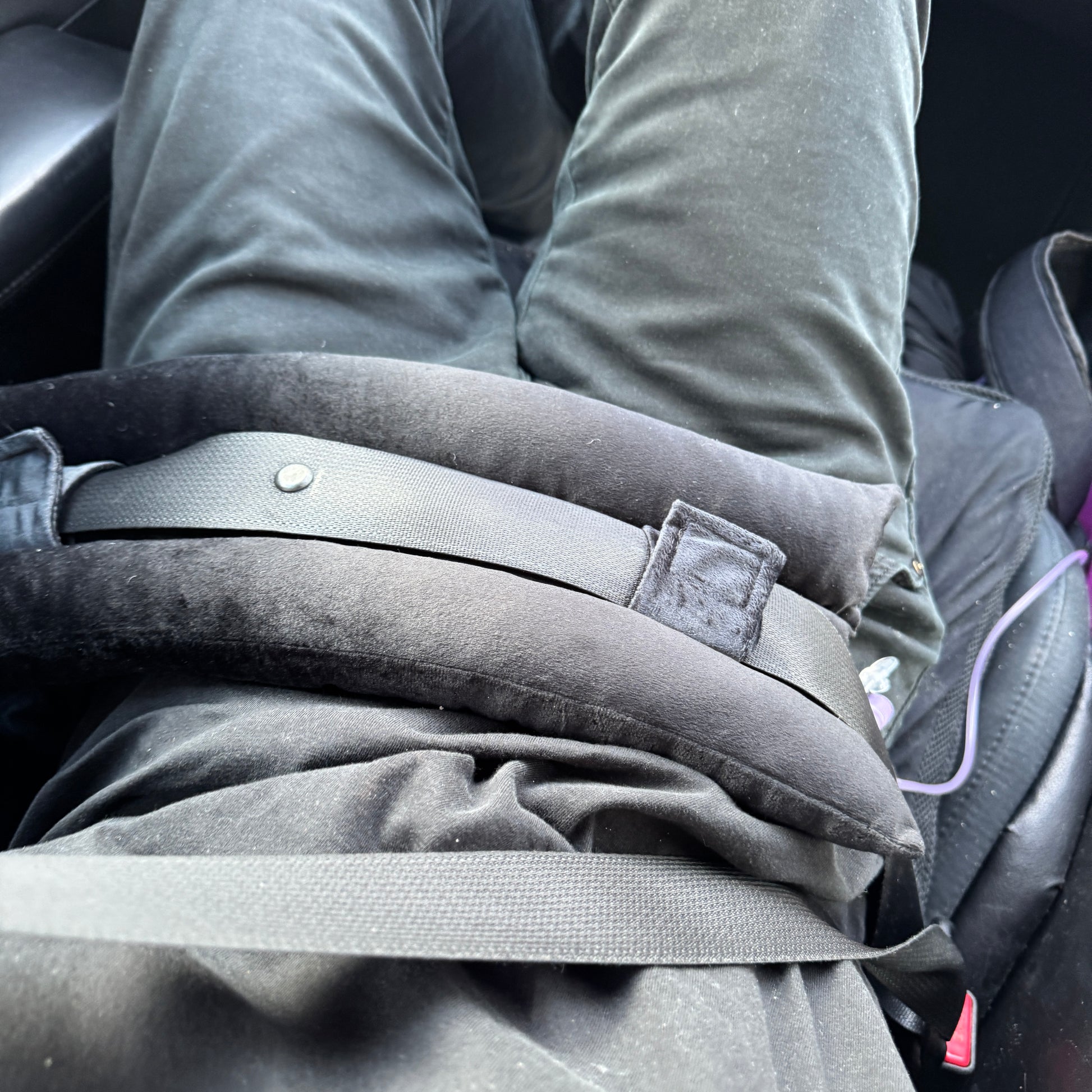 Image Description: A long, padded black cushion with adjustable straps, shown wrapped around a seatbelt. Demonstrated being used flat across the lap, to how it creates a comfortable barrier between the body and the seatbelt.