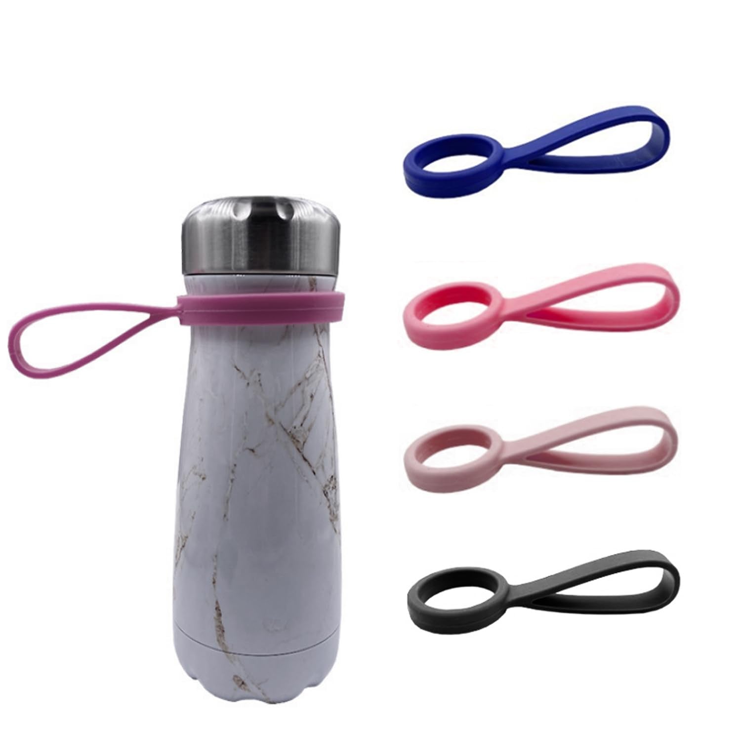 This flexible silicone strap stretches securely over the lid of most standard drink bottles, giving you a simple loop to hold, hang, or hook your bottle on bags, prams, wheelchairs, or hooks.
