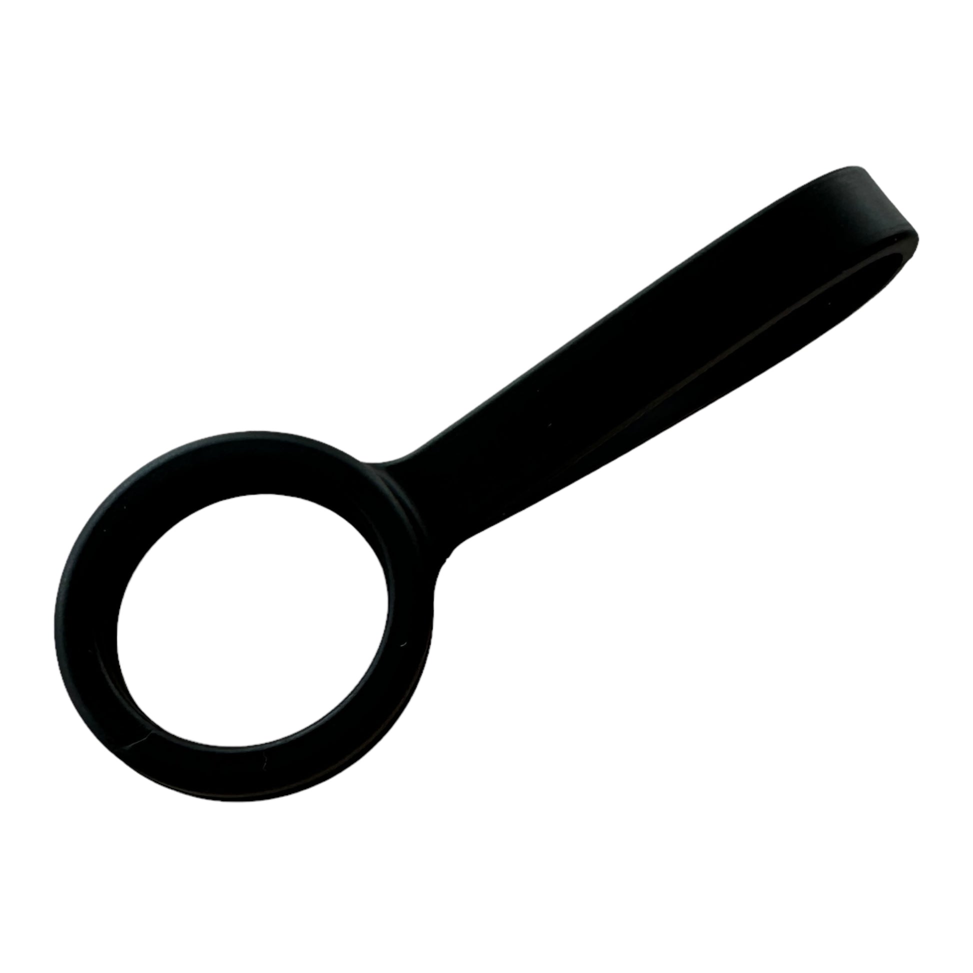 Image Description: A flexible silicone strap with a ring on one end and a looped handle on the other. The ring is designed to stretch over the lid of a standard drink bottle, creating a carry loop. The strap is shown in a solid navy blue colour and is made from smooth, grippy silicone.