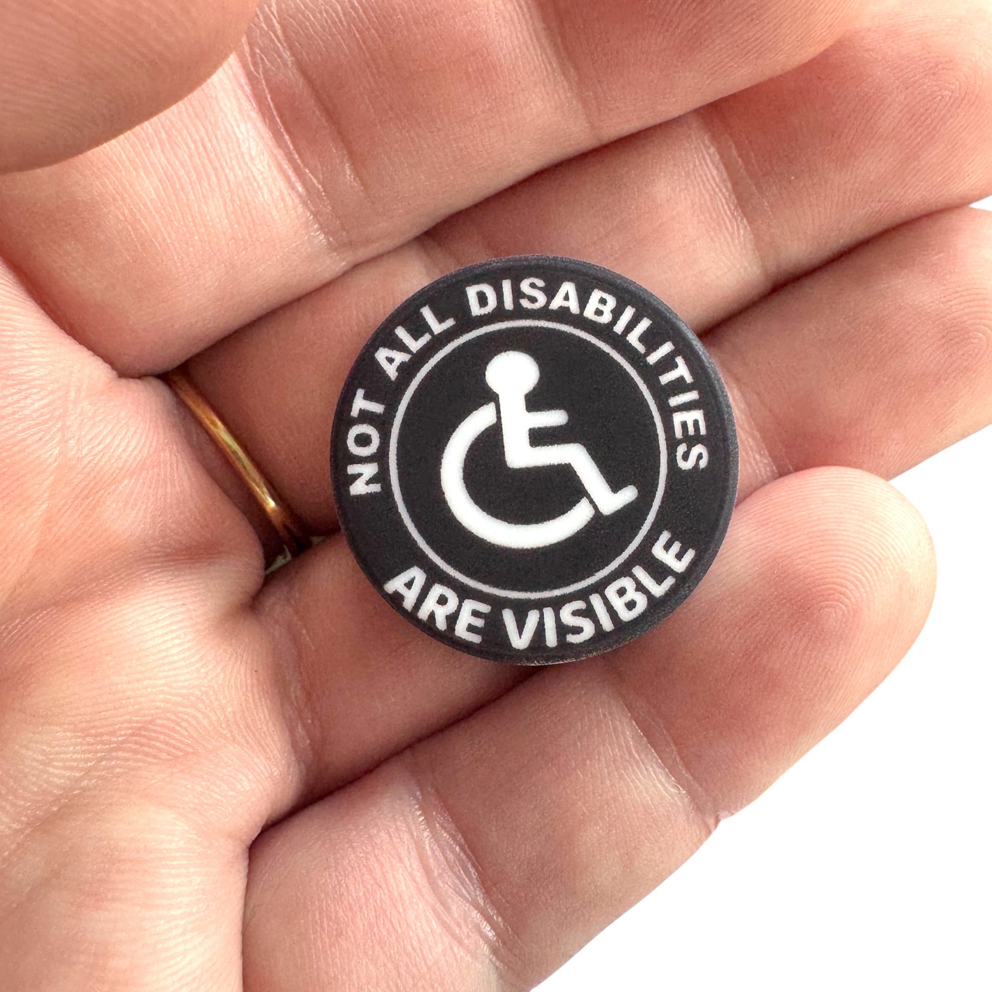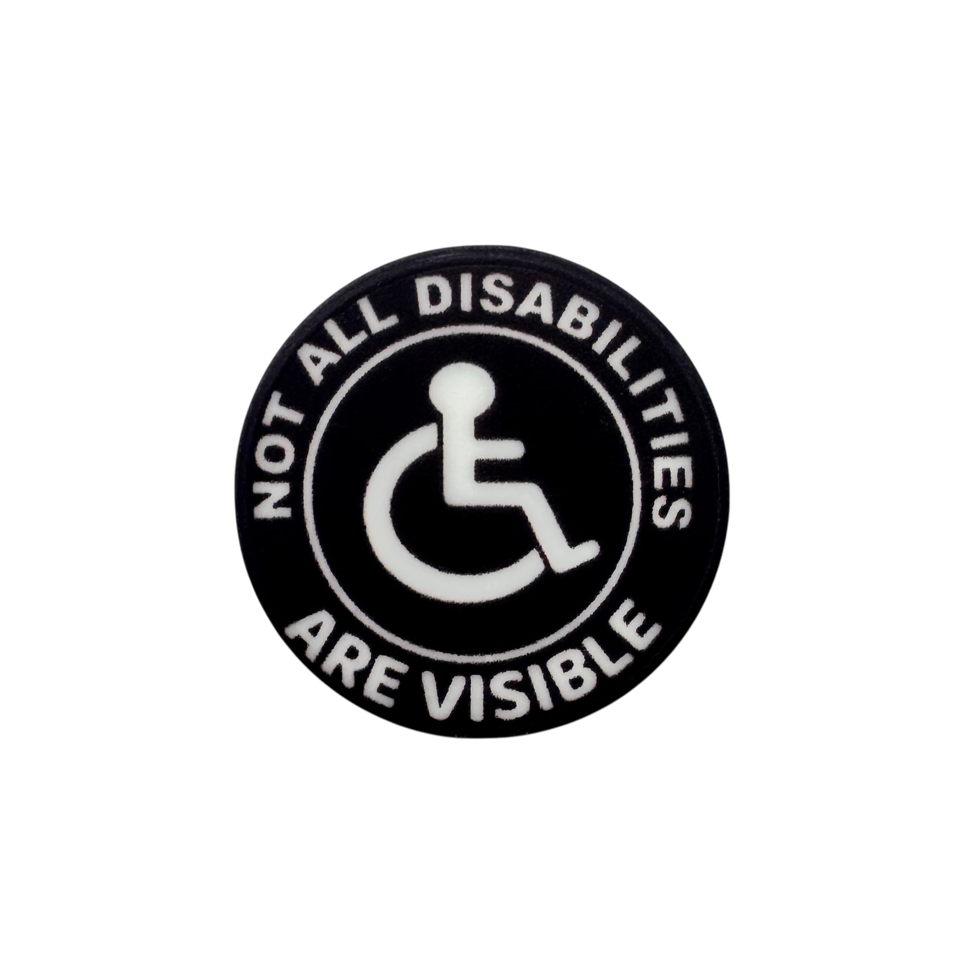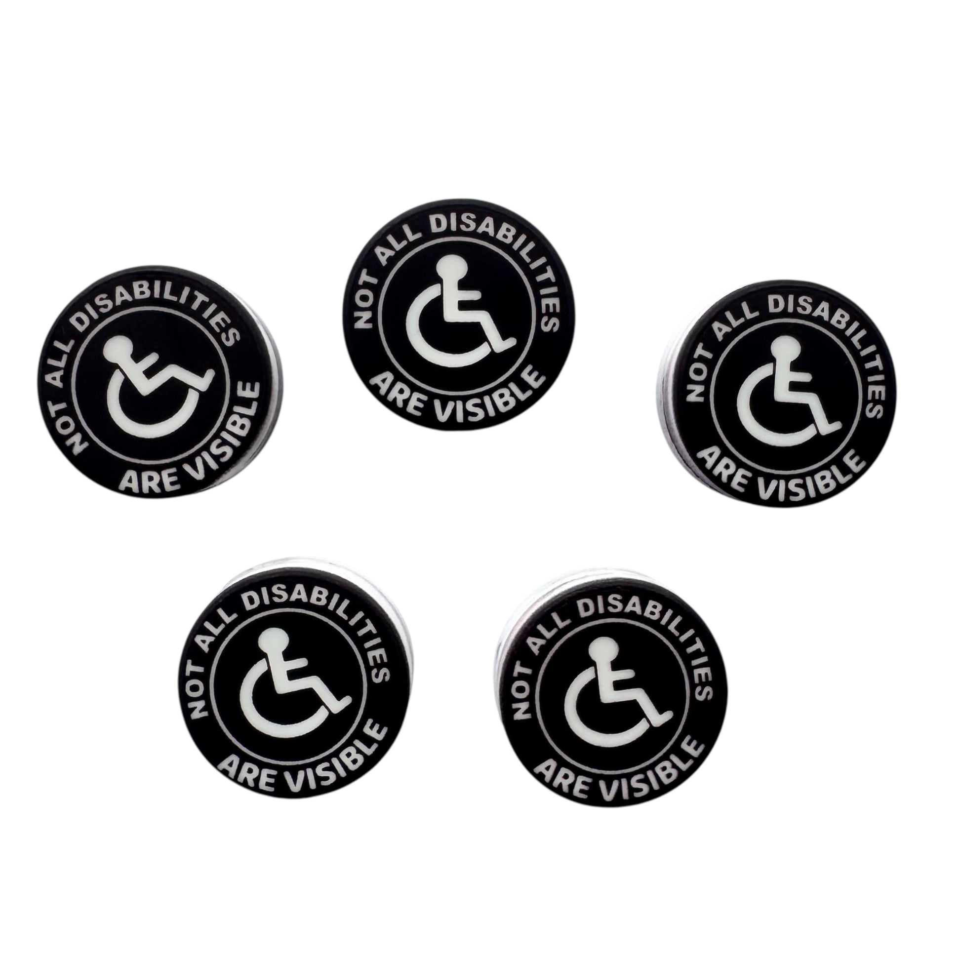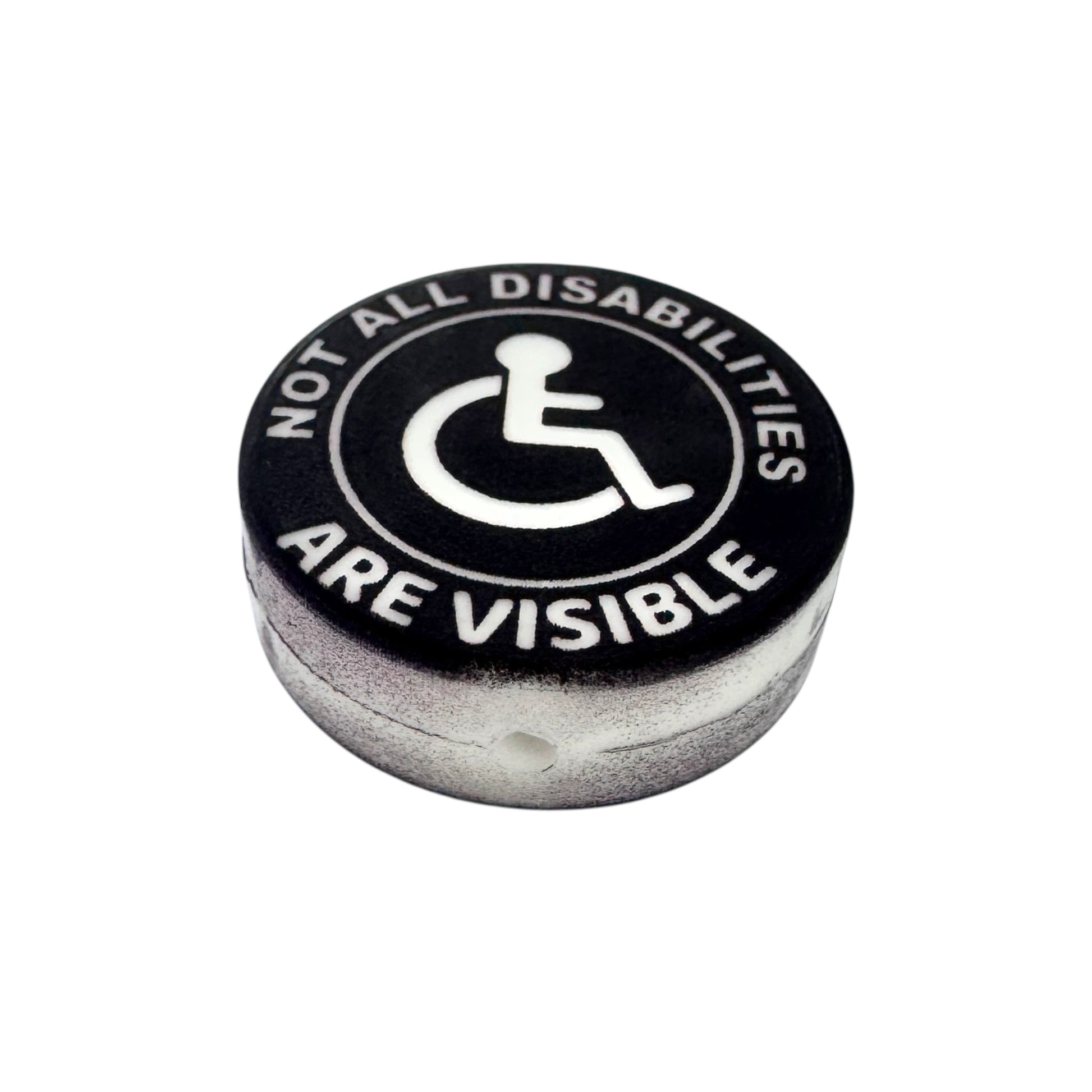Image Description: A round black silicone bead featuring a white accessibility symbol (a person in a wheelchair) shown in the centre. Surrounding the symbol, in bold white lettering, are the words “NOT ALL DISABILITIES ARE VISIBLE.” The design is high-contrast and easy to read, making it both eye-catching and meaningful as an awareness-raising accessory.