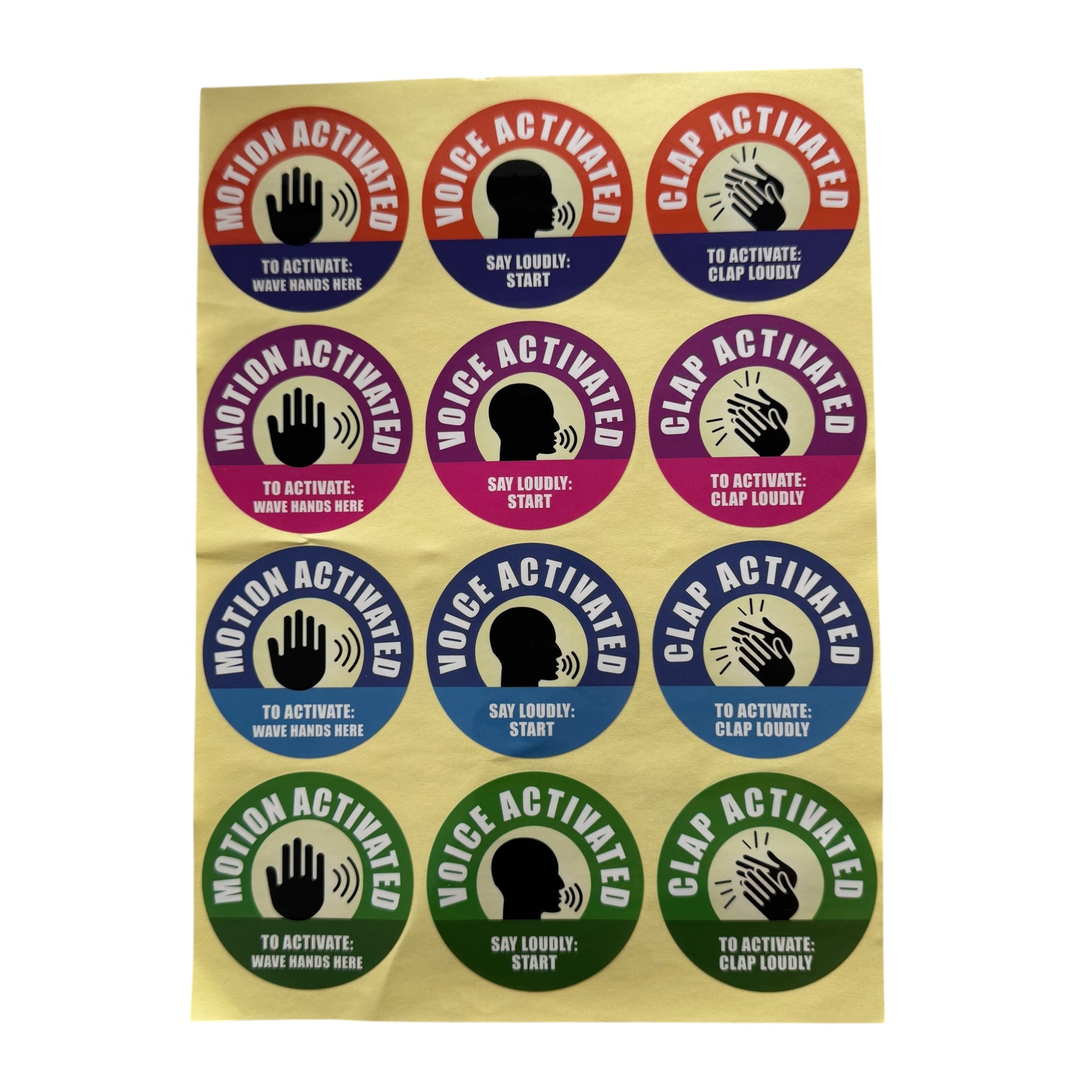 Image DescriptionA sheet of colourful round stickers with three designs. One reads “Clap Activated – To Activate: Clap Loudly” with a clapping hands icon. Another reads “Voice Activated – Say Loudly: START” with a speaking silhouette icon. The third reads “Motion Activated – To Activate: Wave Hands Here” with a raised hand icon. The stickers are shown in bright red, blue, green, and purple colours.