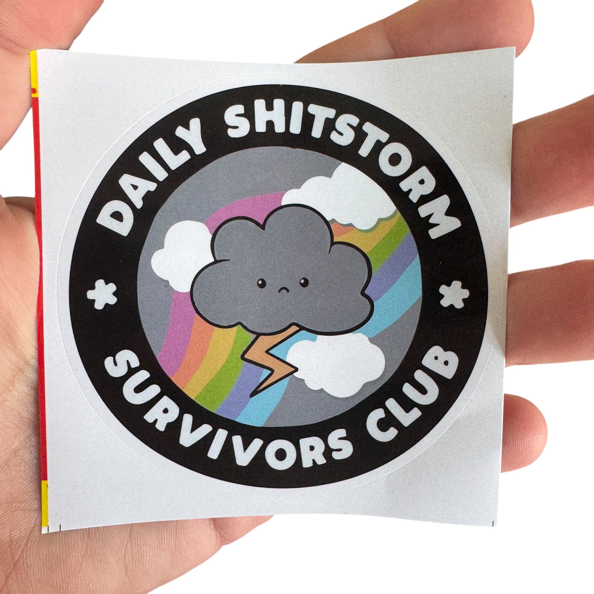 Image Description: A circular sticker with a black border featuring white text that reads “Daily Shitstorm Survivors Club” with a star-like symbol separating the phrases. In the center is a sad-faced grey cartoon storm cloud with a yellow lightning bolt and white clouds around it. Behind the cloud is a rainbow with muted tones of red, orange, green, blue, and purple. The overall vibe is playful and defiant, mixing cuteness with sarcasm.