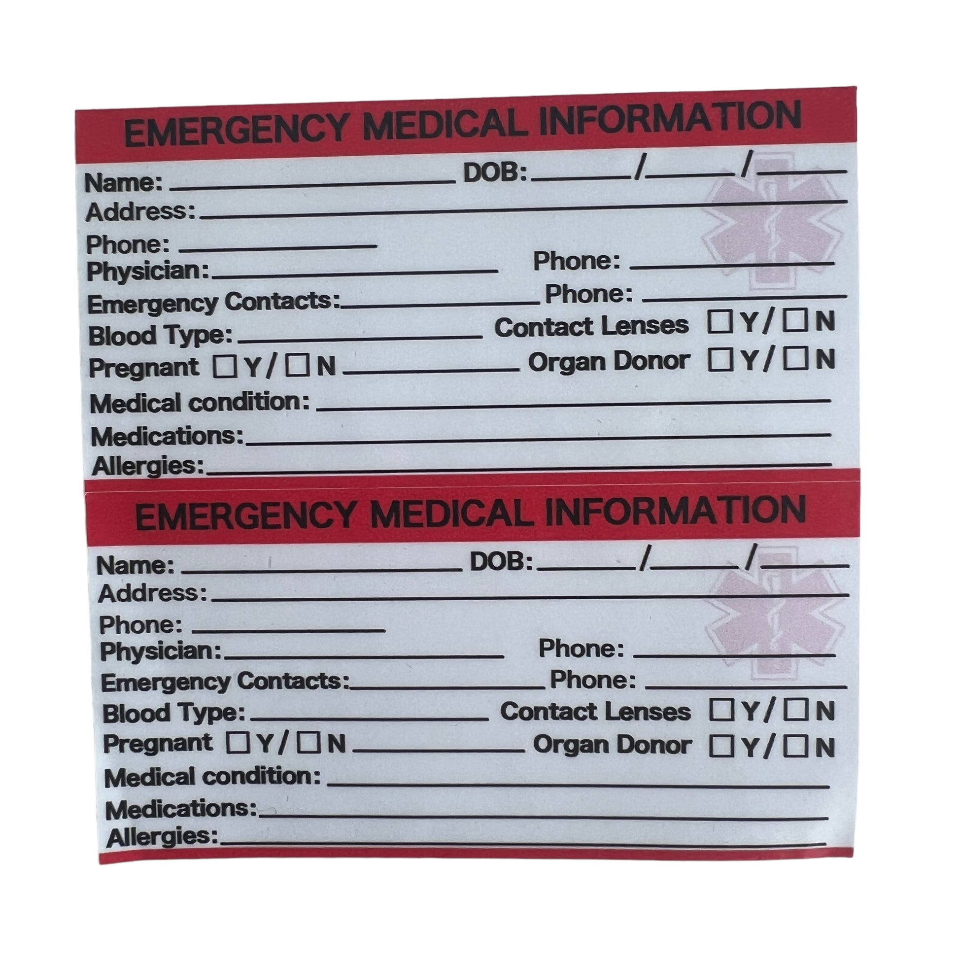 Image Description: Emergency Medical Information card has a red strip across the top and the bottom, the sticker itself includes various fields to add your personal information in an emergency such as your or a child’s name, address, email, date of birth, phone number, emergency contact name and number, Drs name and number, blood type, medical conditions, allergies, medication, contact lens, and organ donor.