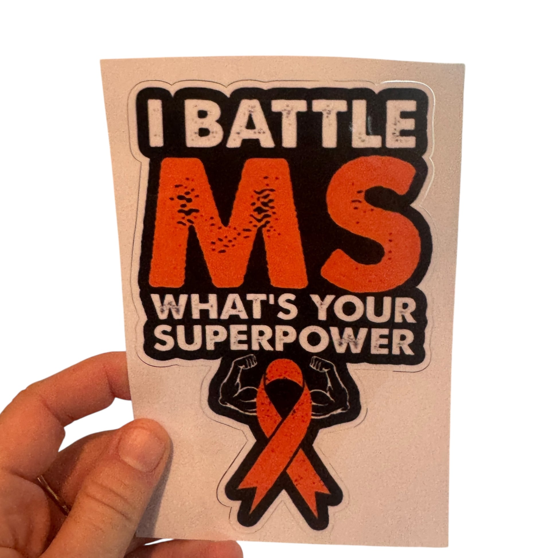 Image Description: A bold black and orange sticker that reads I battle MS, what’s your superpower? with an orange awareness ribbon and flexing arm graphic.