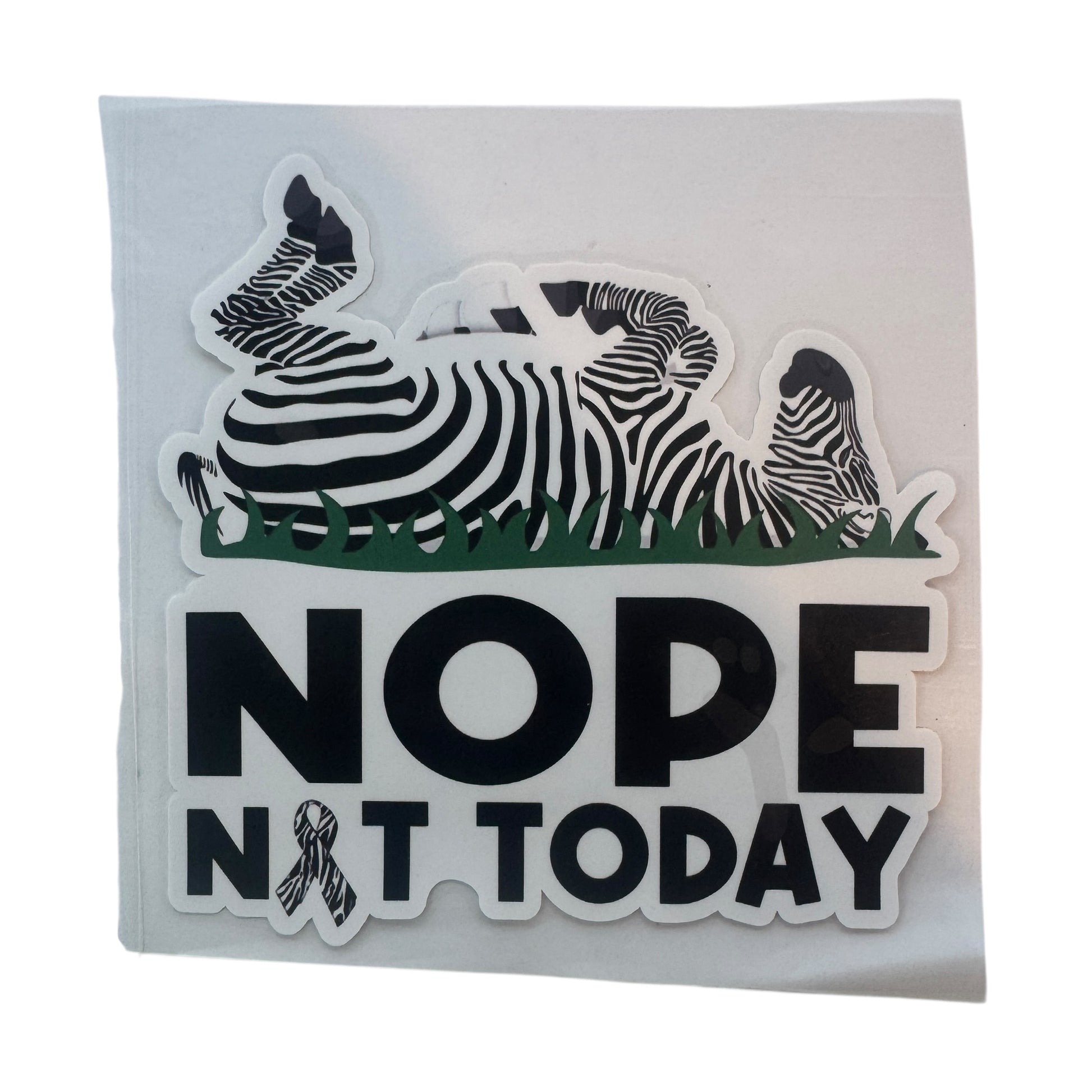 Image Description: A sticker featuring a zebra lying in the grass with the words Nope, Not Today in bold black lettering. A zebra-patterned awareness ribbon sits below the text, symbolising Ehlers-Danlos Syndrome and rare disease awareness.