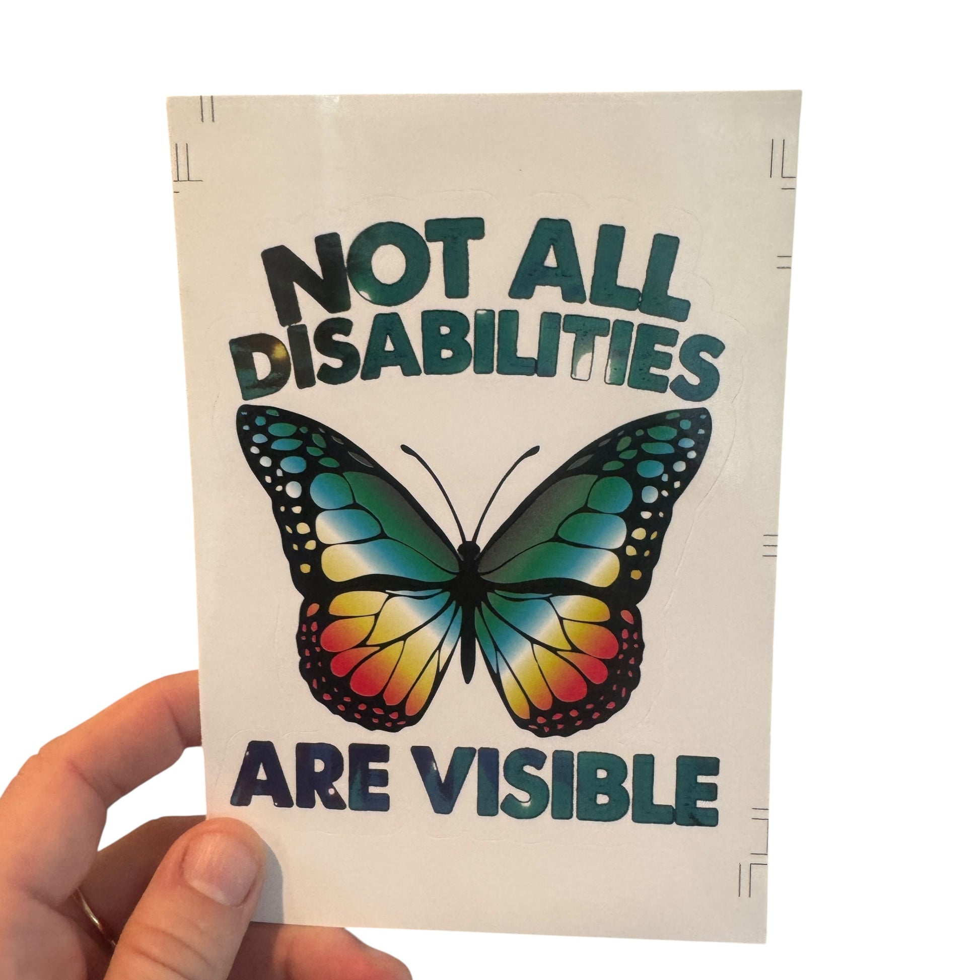 Image Description: A colourful butterfly sticker with wings in shades of green, blue, yellow, and red sits in the centre. Above it reads “Not All Disabilities” and below it reads “Are Visible” in bold gradient lettering. The design is eye-catching, uplifting, and carries a powerful awareness message.