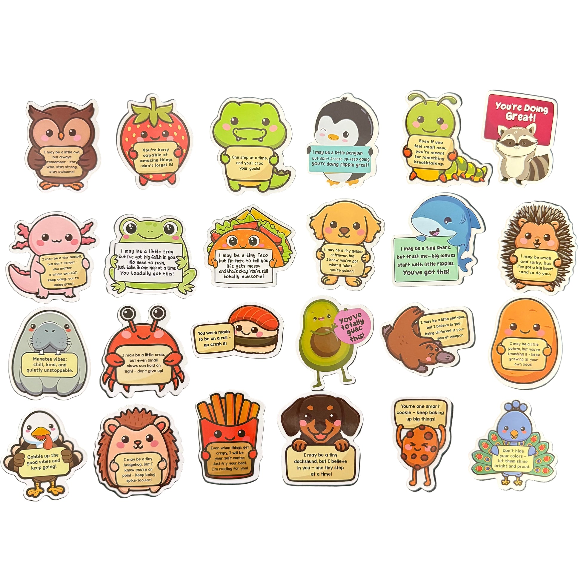 Image Description: A group of colourful encouragement stickers featuring cute characters including animals and a smiling fruit and vege characters, each holding a positive affirmation sign. Designs shown include a bunny, bear, koala, cat, penguin and strawberry character, each with a short motivational message. Stickers are displayed on a white background. An example of a message is a strawberry holding a sign, it says: “You’re berry capable of amazing things! - Don’t forget it”. And a dolphin holding a sign saying: “Keep swimming forward! You’re making waves in all the right directions!”