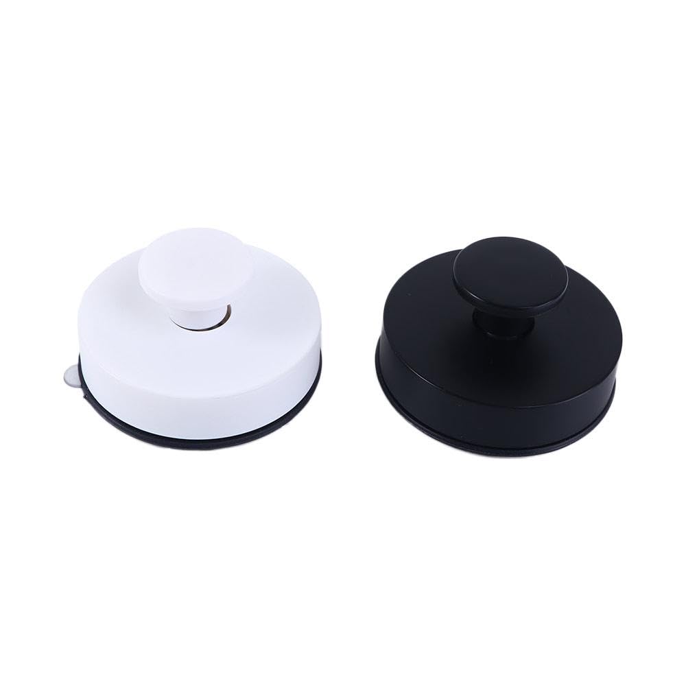 A round suction handle available in black or white, shown attached to smooth bathroom and household surfaces. Demonstration images show it being cleaned, applied, and twisted to lock in place, holding lightweight items such as towels or accessories.